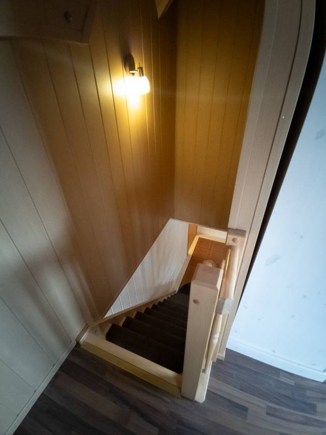 Die Treppe im Erdgeschoss führt ins Schlafzimmer, dieses ist Ausgestattet mit einem großen Kleiderschrank, einem 190x200 cm großem Doppelbett, 2 Hockern und einem Fernsehgerät.