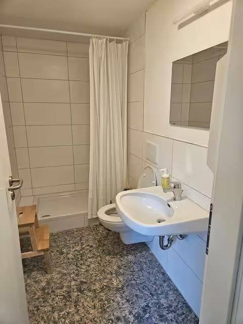 Zwei Gemeinschaftsbäder mit je einer Dusche und WC liegen auf der selben Etage, ein weiteres Bad mit 2 Duschen und 2 WCs einen Stock höher.