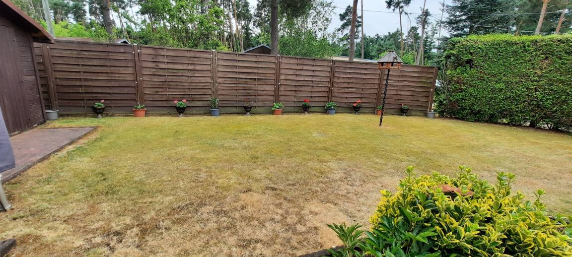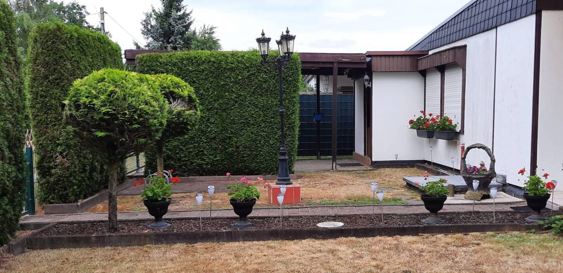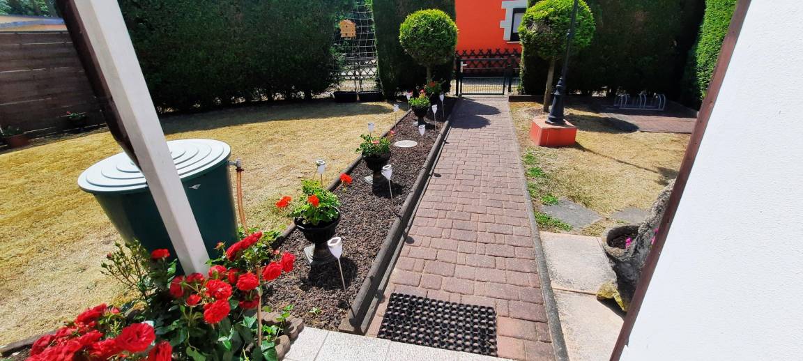 Das blickdichte umzäunte Grundstück umfasst ca. 250 m². Es verfügt über eine Rasenfläche einer Rabatte mit Blumen, einer Hollywoodschaukel, 2 Sonnenliegen mit Überwurf, einer Terrasse mit Sitzgruppe + Auflagen für bis zu 6 Personen , einen PKW Stellplatz überdacht mit Carport und einen Fahrradabstellplatz mit Ständer. Einem Tillvex Alu Sonnenschirm + Abdeckung Ø 300 cm mit Kurbel & Windschutz der UV-Schutz hat, um 360° drehbar und wasserdicht ist.