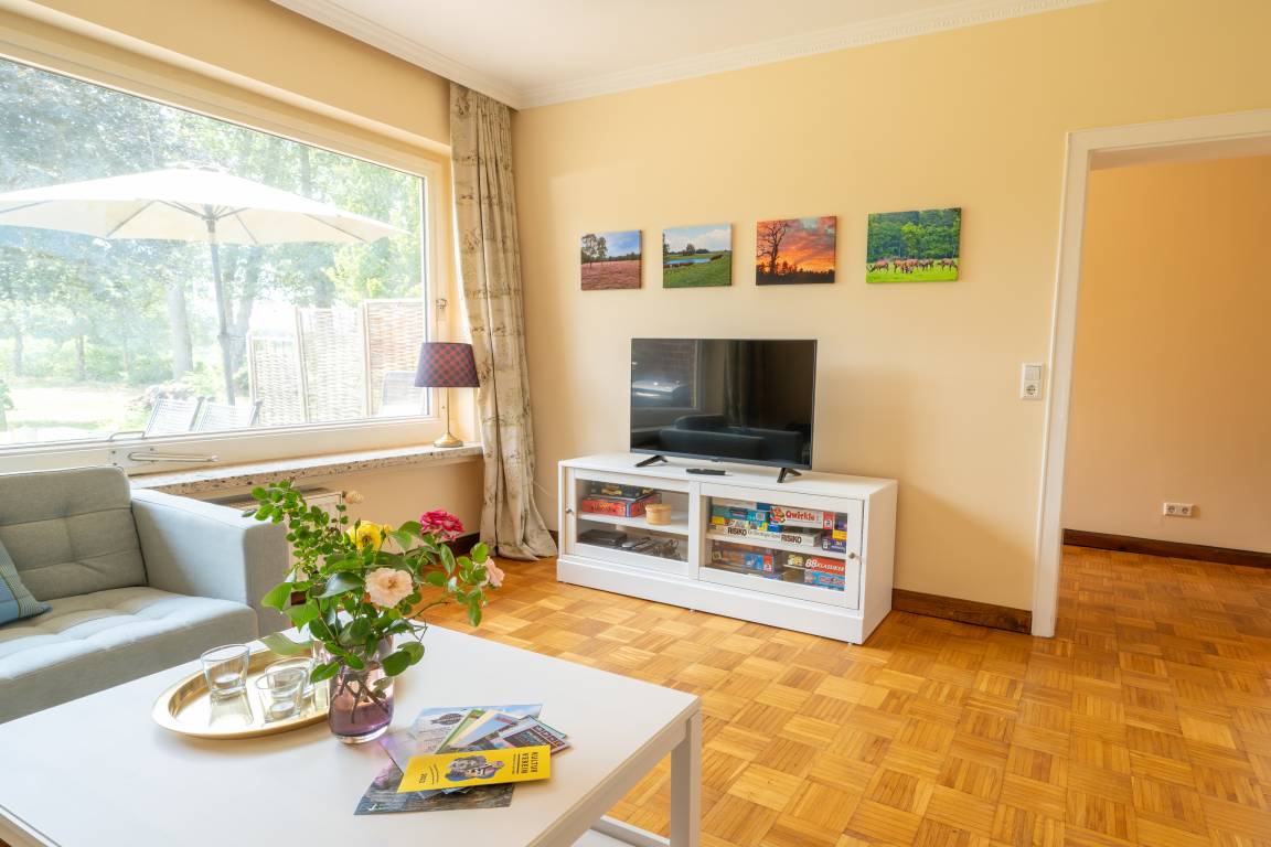 Ankommen und Wohlfühlen: 2 Schlafzimmer (jeweils mit Doppelbett 1,80 breit), gemütliches Wohnzimmer mit TV und Spielesammlung, Duschbad im Obergeschoss mit Waschmaschine, kleines Bad mit WC im Erdgeschoss, voll eingerichtete Küche inkl. Spülmaschine. Eichenparkett- , Laminatböden und Fliesen.
