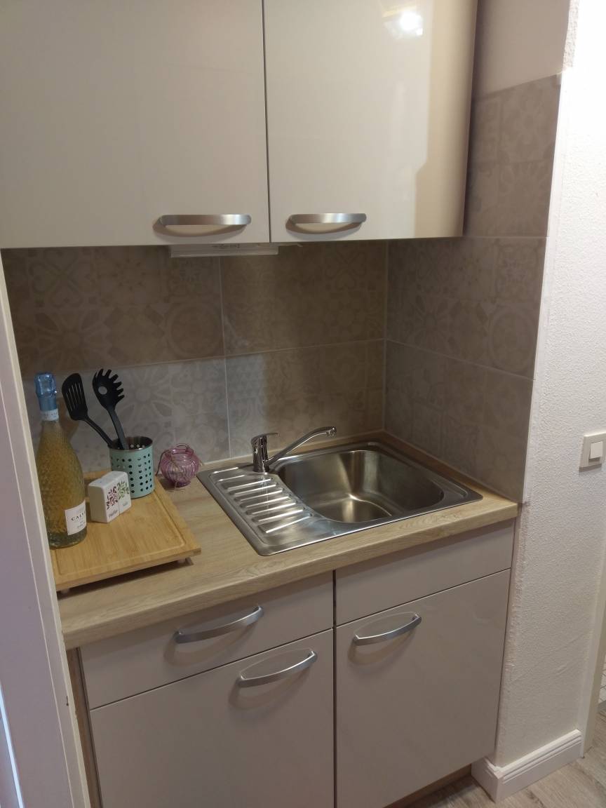 Eine kleine Küchenzeile mit Doppelkochfeld, Kühlschrank, Kaffeemaschine, Toaster, Wasserkocher und Mikrowelle bietet alles was man für einen erholsamen Urlaub braucht.