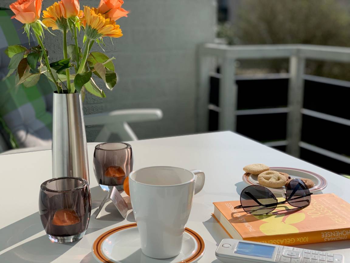 Ihnen steht die große Sonnenloggia (überdachter Balkon) mit Sonnenmarkise, Balkontisch und Relaxstühlen (Westseite - Gartenseite) zur Verfügung. Sie können auch gerne den hauseigenen Garten nutzen und sich dort in die Sonne legen!