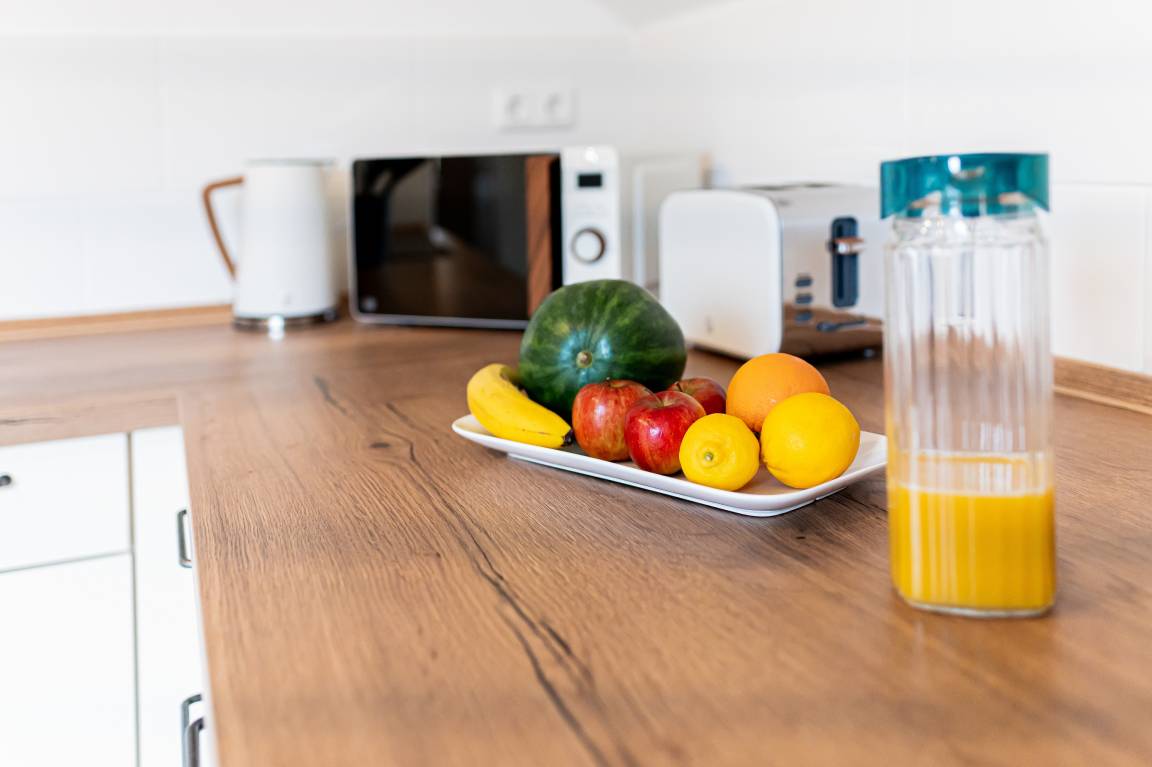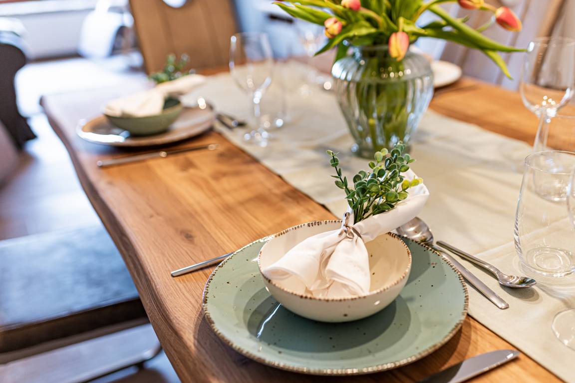 Die Küche ist mit Backofen, Ceranfeld, Kühlschrank mit Gefrierfach, Kaffeemaschine, Toaster, Wasserkocher und Mikrowelle sowie Geschirrspüler, Waschmaschine und Trockner hochwertig ausgestattet. Es ist ausreichend Geschirr vorhanden, um gemeinsam zu kochen und gemütlich anschließend im Esszimmer zu speisen.