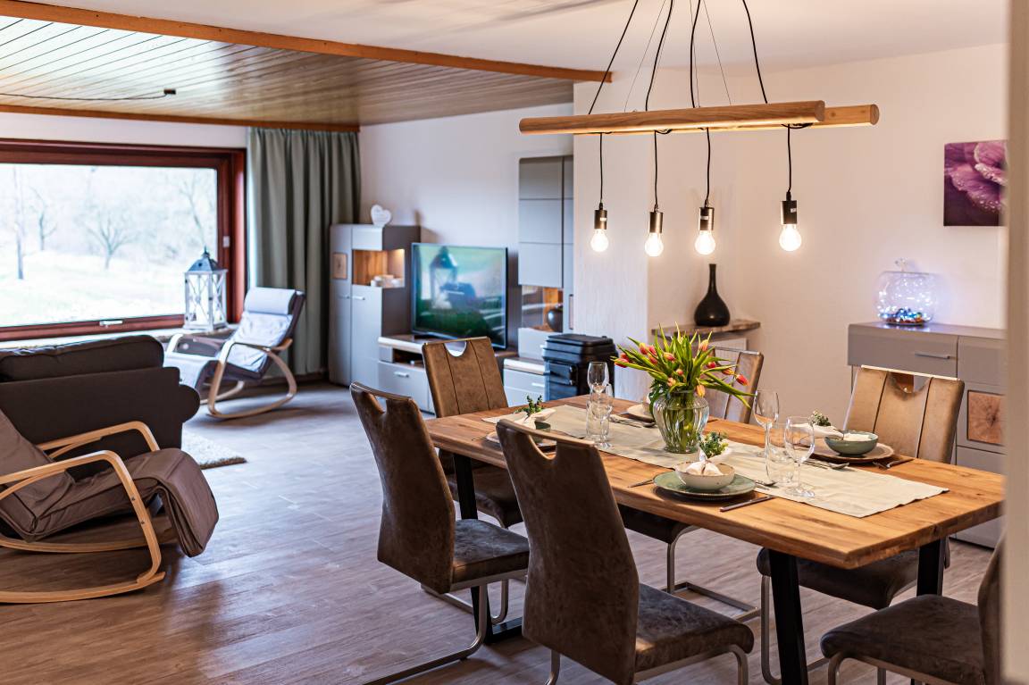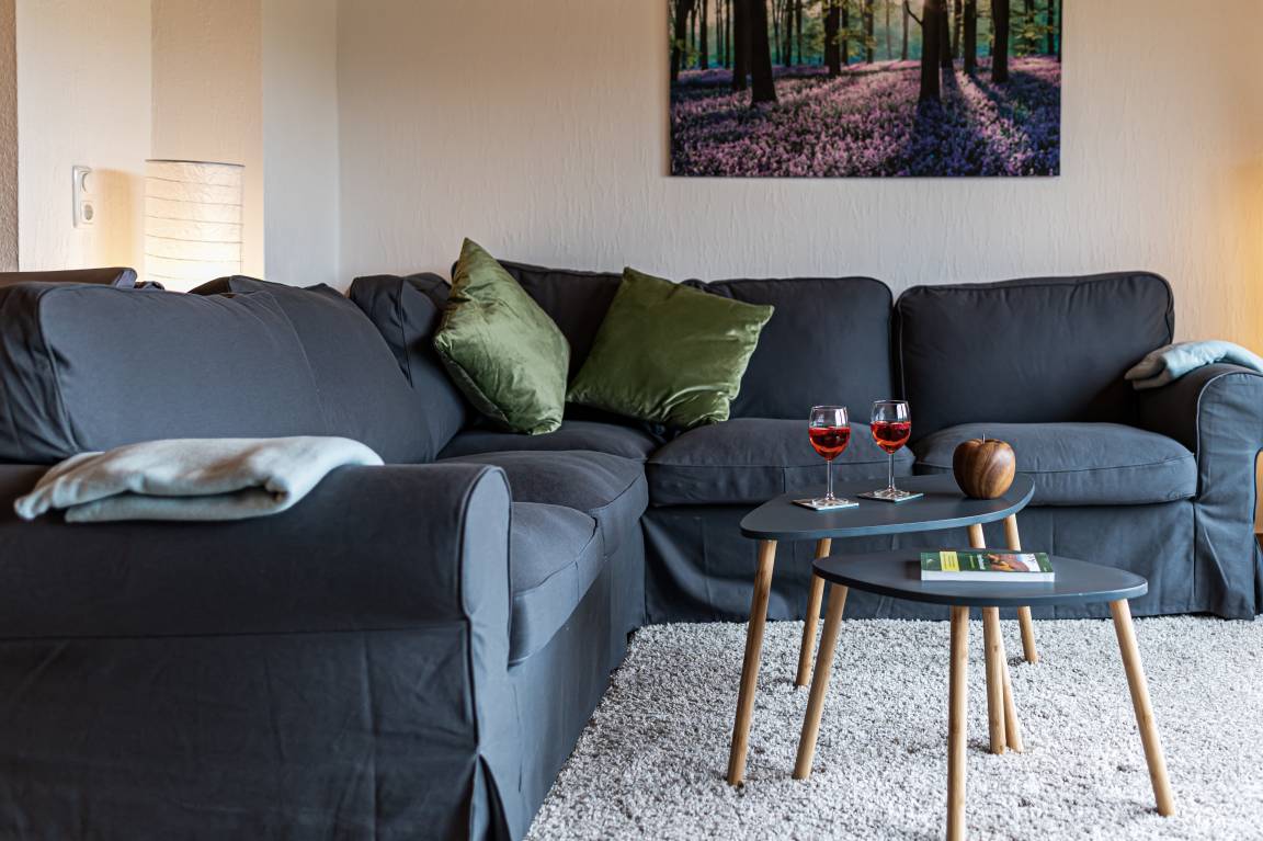 Das Wohnzimmer hat ein großes Panoramafenster mit Blick auf die Natur und den Harz. Ein großes Ecksofa lädt zum Entspannen ein. Ein Flat-TV mit Entertainmentpaket und ein Radio sind vorhanden.