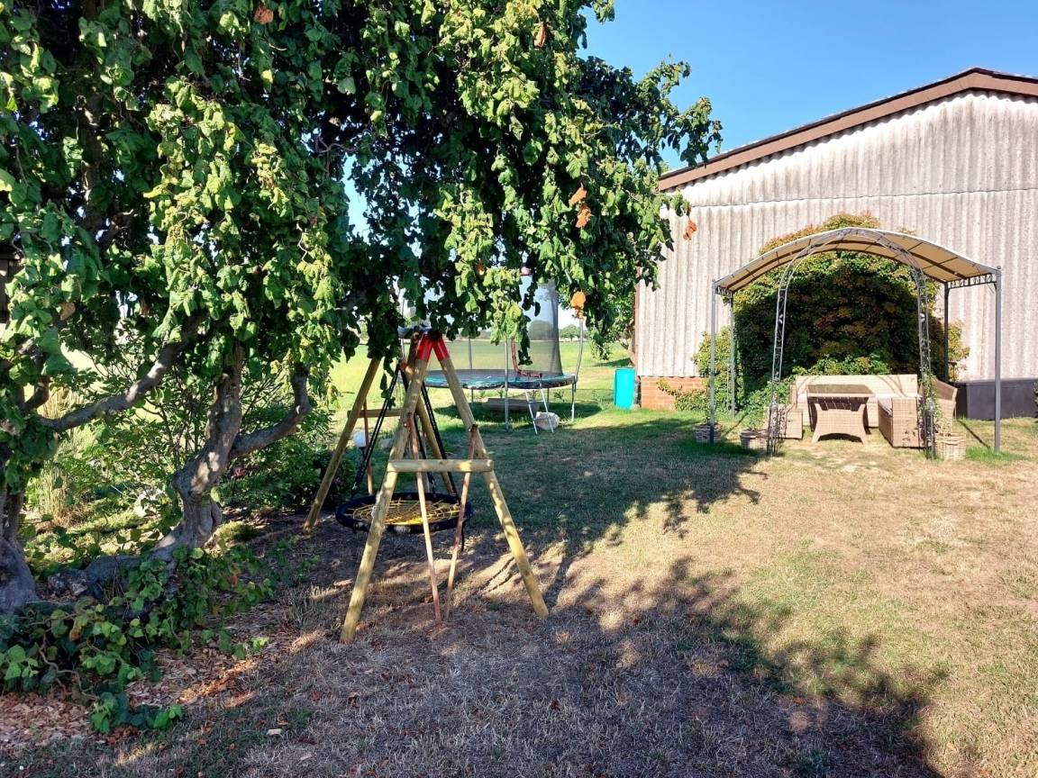 Auf dem großzügig angelegten Grundstück ist ein Sitzbereich, wo Sie die Sonne genießen oder abends gemeinsam Grillen können. Hier ist ein Trampolin eine Schaukel für Kinder vorhanden.