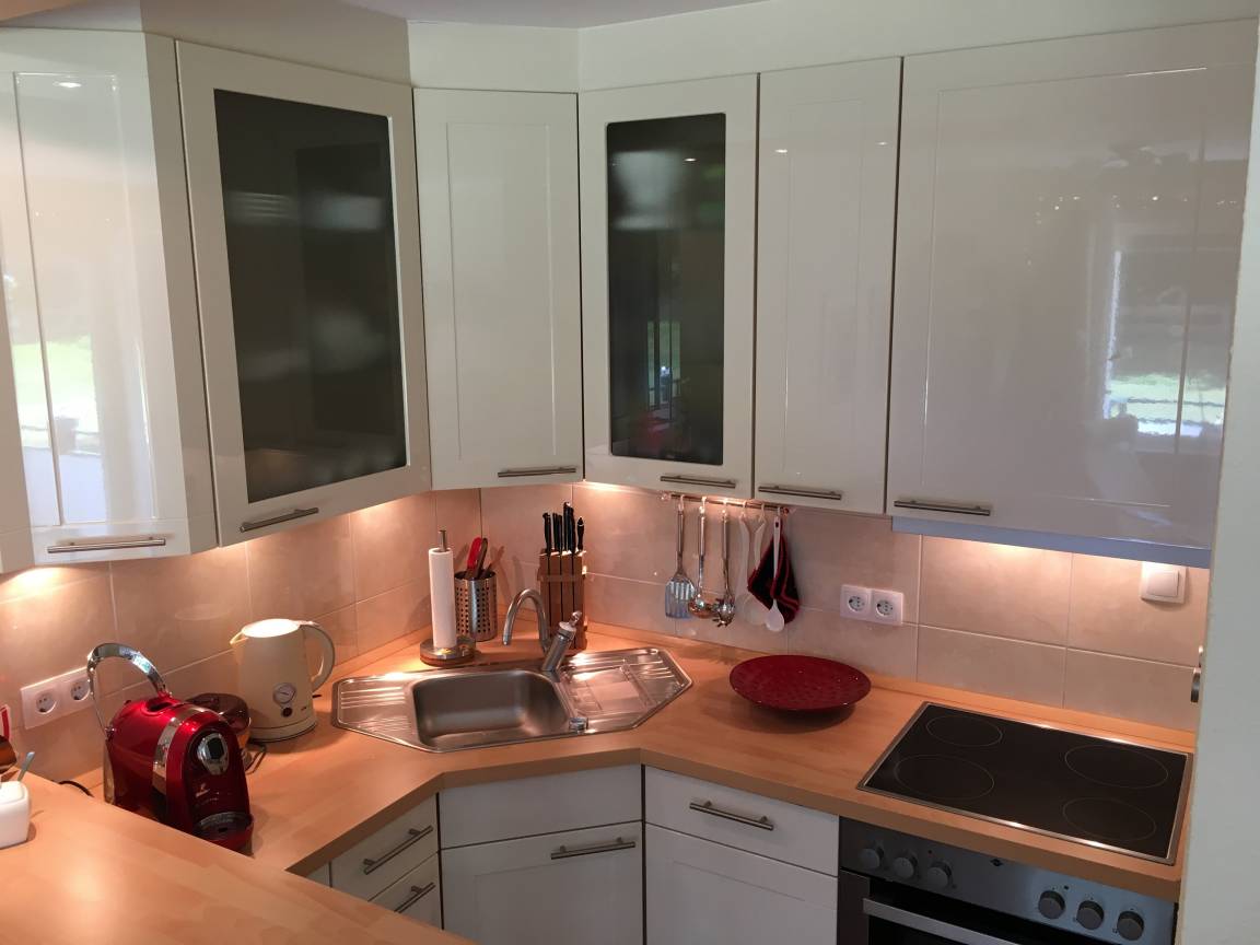 Die Markeneinbau-Küche ist mit Kühlschrank mit Gefrierfach, Cerankochfeld mit Dunstabzug, Backofen, Geschirrspülmaschine, Kaffeemaschine, Cafissimo (Tschibo), Wasserkocher und Eierkocher ausgestattet. Des Weiteren verfügt die Küche über verschiedenste Gläser, sowie hochwertige Geschirr- und Besteck-Sets, um ihre selbstgemachten Mahlzeiten ansprechend zu präsentieren. Pfannen und Kochtöpfe sind ebenfalls vorhanden.