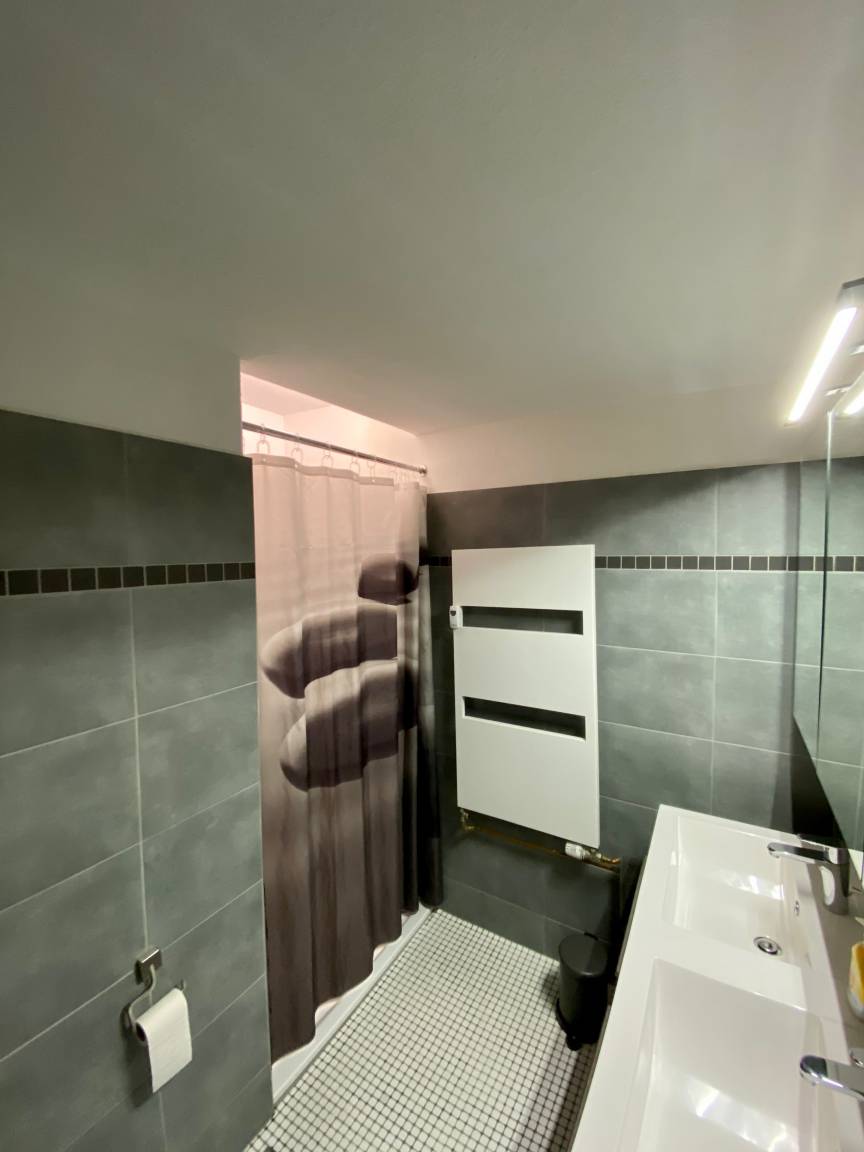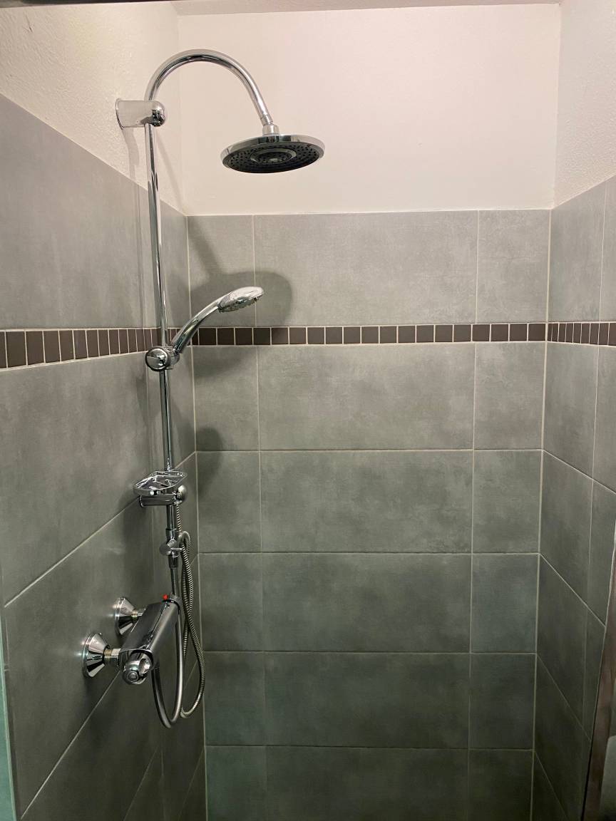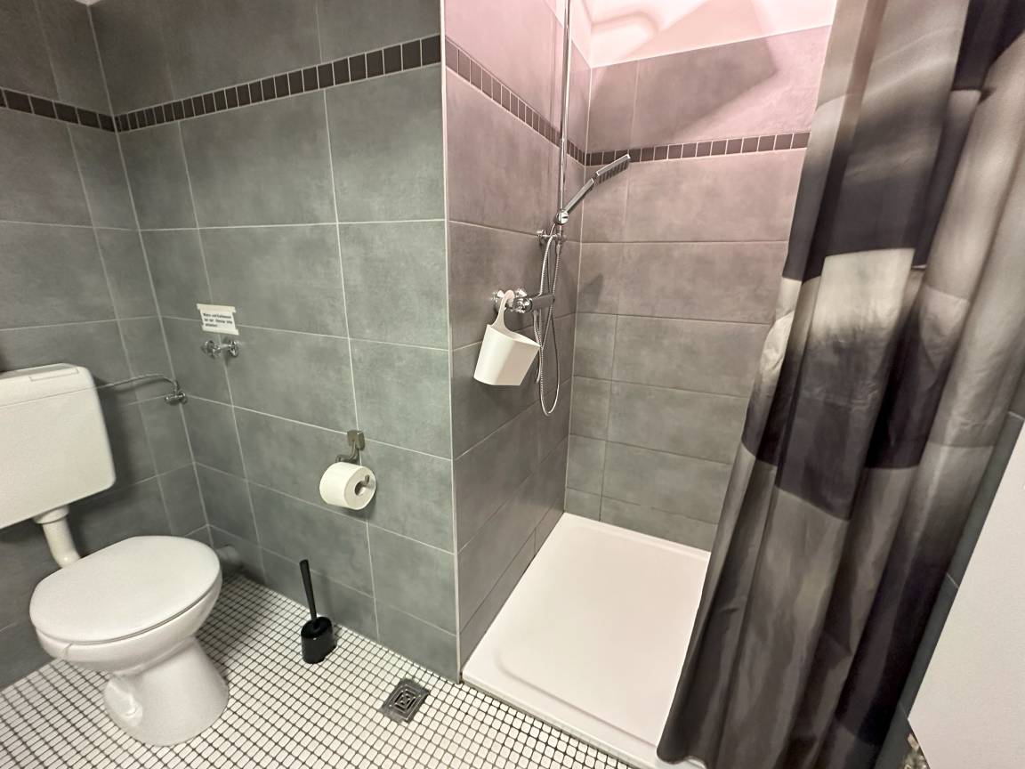 2. Sanitärraum mit Toilette, ebenerdiger großer Dusche, Thermostat und Handtuchheizkörper