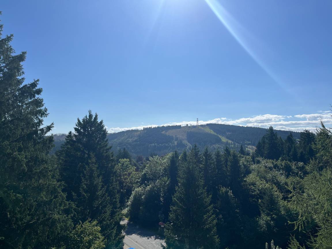 Durch die große Fensterfront im Wohnbereich und von dem großzügigen Balkon blicken Sie frei über die Baumwipfel hinweg direkt auf den Bocksberg mit seinen Skipisten und dem Bikepark – ein Panorama, das im Ferienpark kaum zu übertreffen ist. Morgens den ersten Kaffee mit Weitblick genießen, abends den Sternenhimmel über den Bergen beobachten – hier ist der Berg immer „mit im Zimmer".