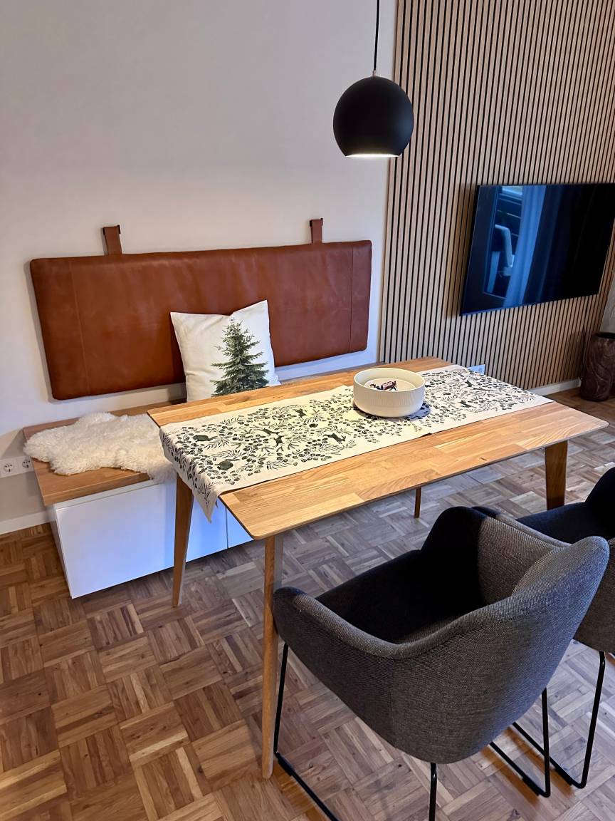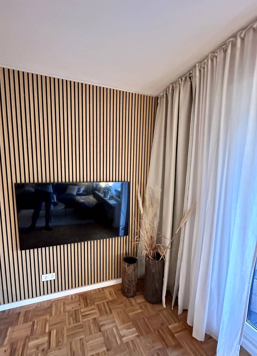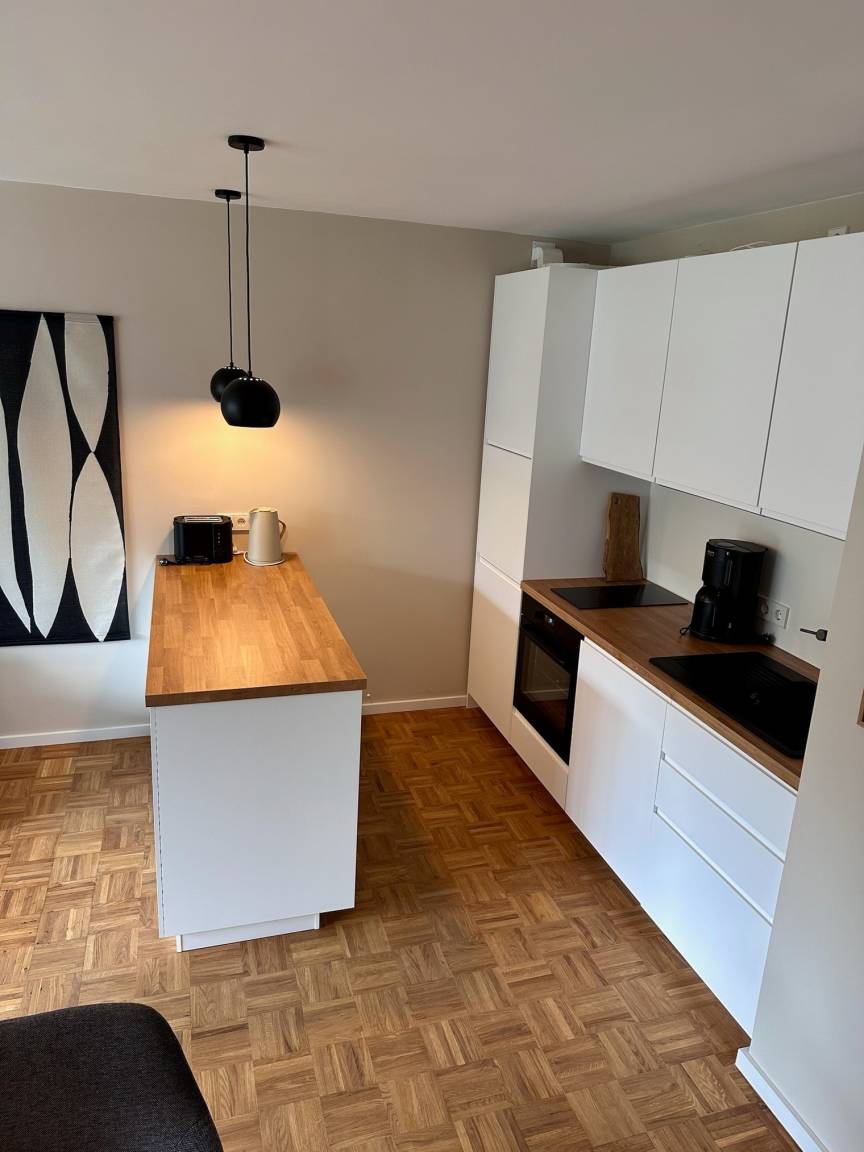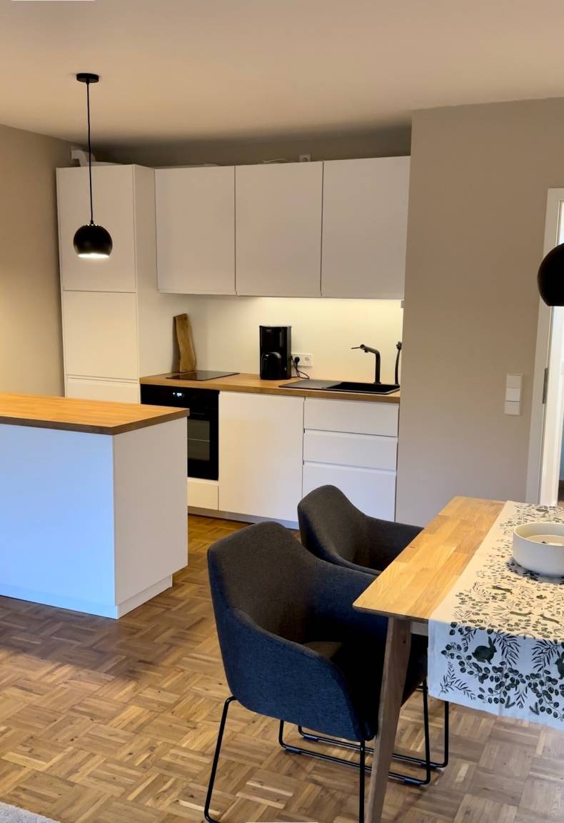 Die Ferienwohnung ist in hellen Farben modern eingerichtet. Mit vielen Holzelementen, Echtholzparkett und Akustikpaneelen lädt sie zum Wohlfühlen ein.