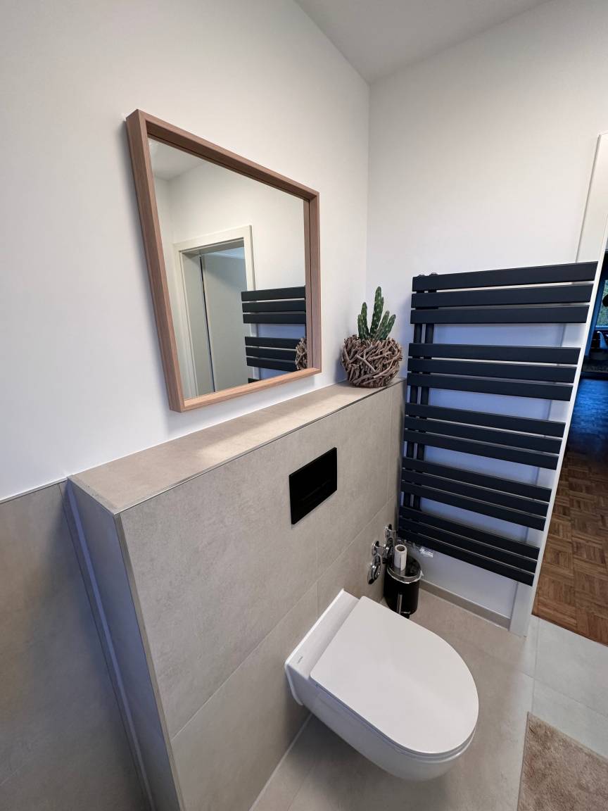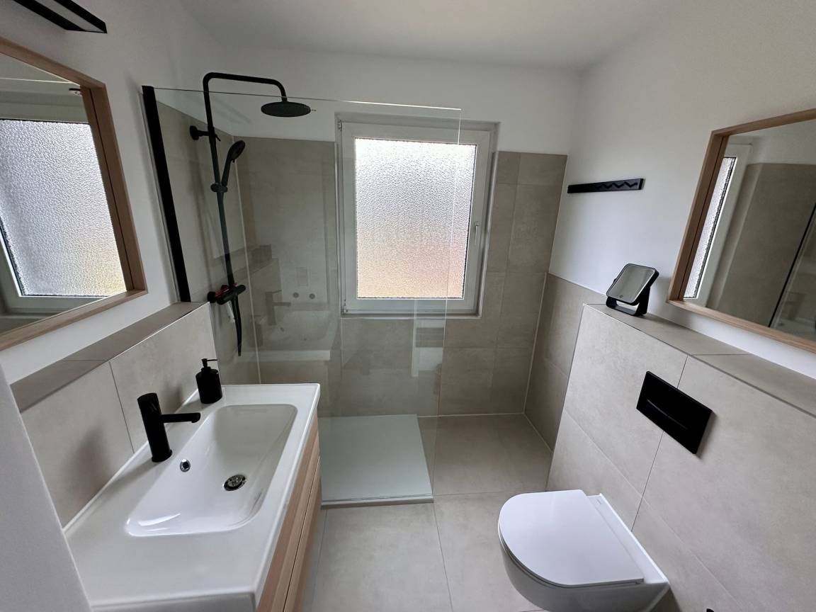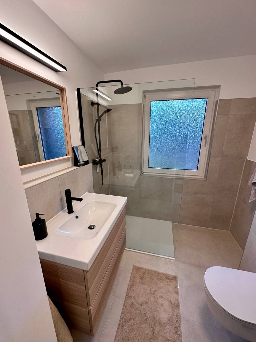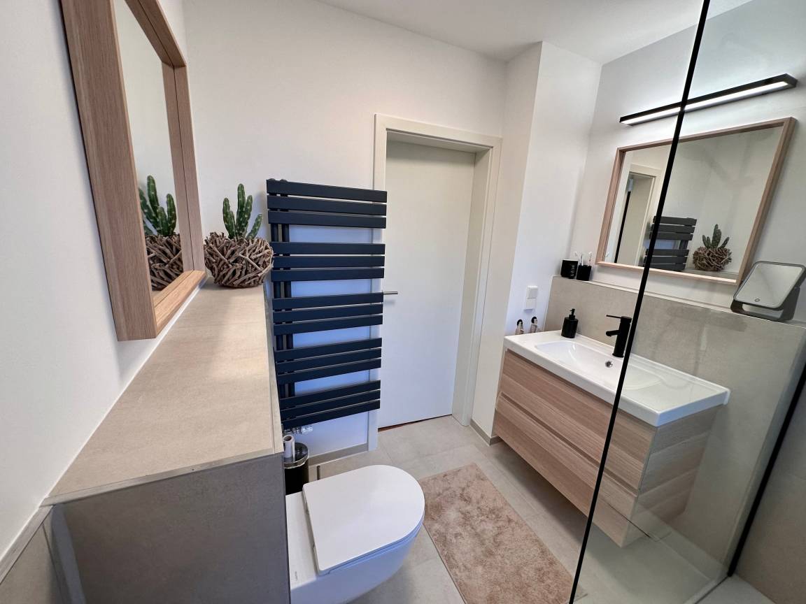 Neben dem komfortablen Schlafzimmer mit schönem Polsterbett (180cm x 200cm) befindet sich ein modernes Bad mit WC, ebenerdiger Regendusche, vielen Ablageflächen und Haartrockner.