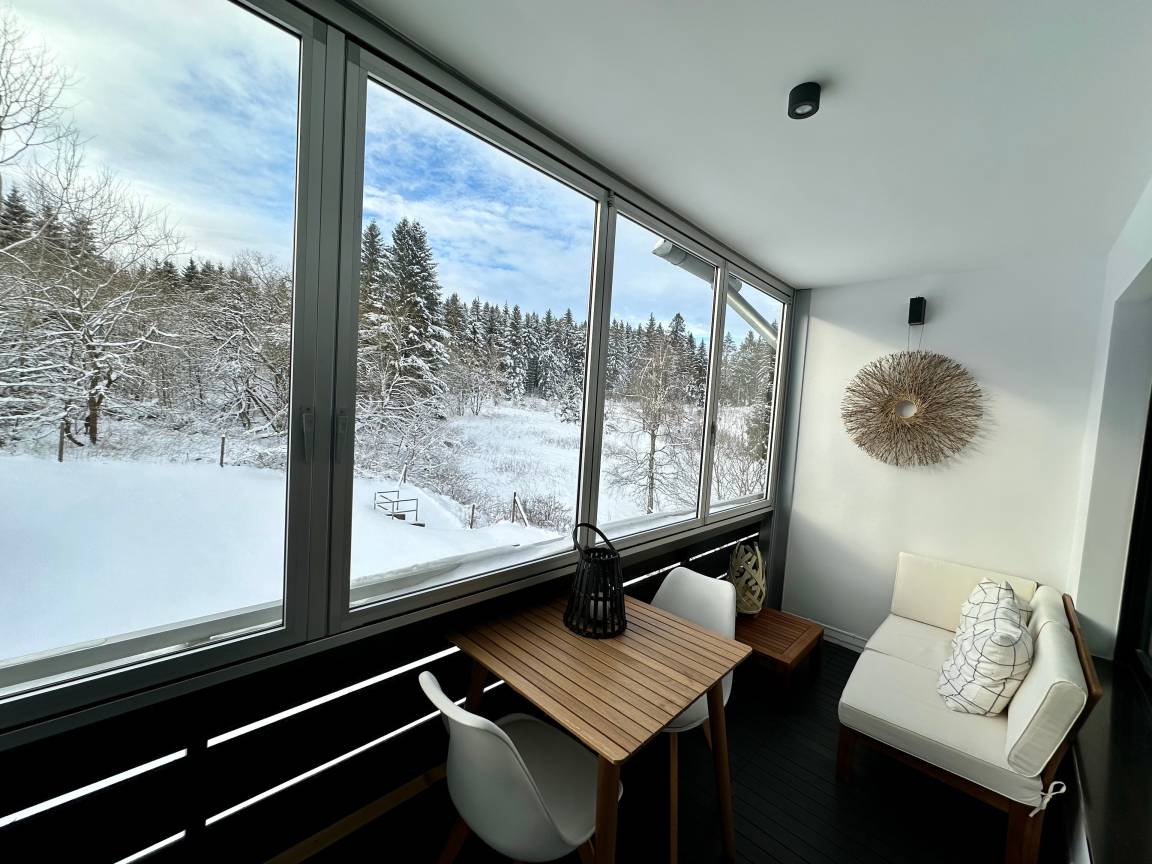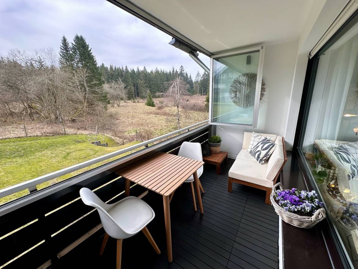 Vom Wohnzimmer haben sie direkten Zugang zum Balkon mit Westausrichtung. Der Balkon lässt sich mit Schiebeelementen schließen. Man hat einen herrlichen Blick auf das Naturschutzgebiet des Harzer Waldes.