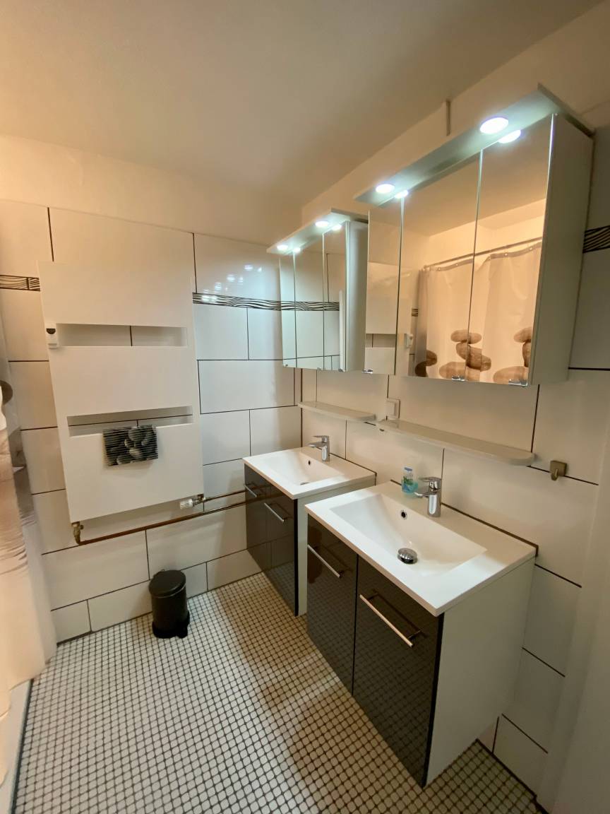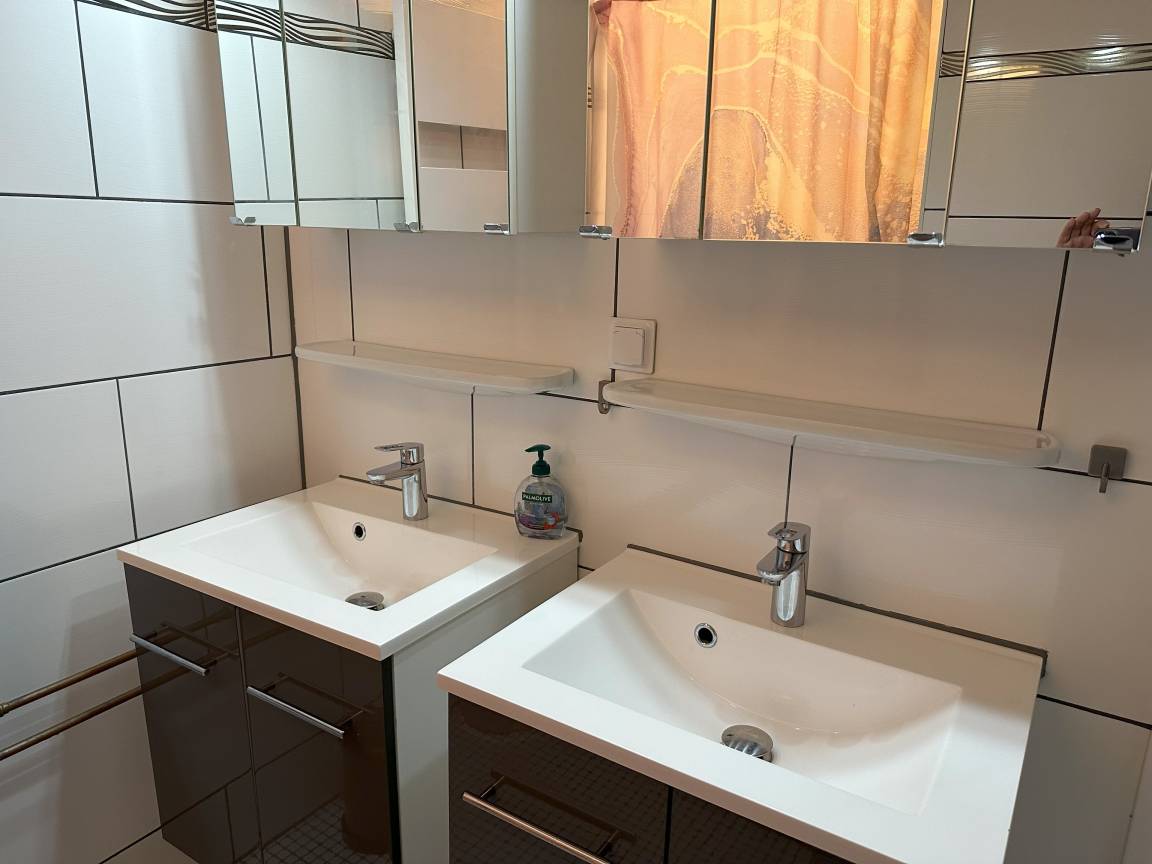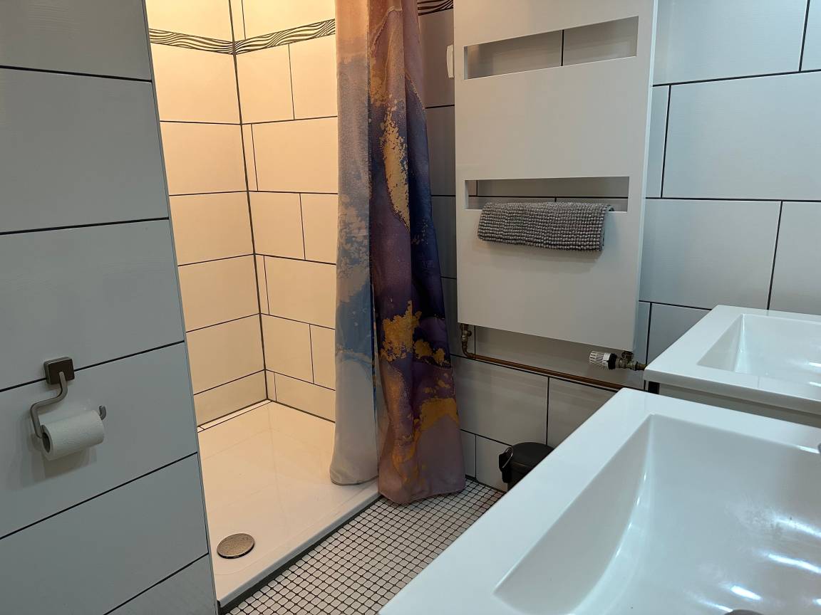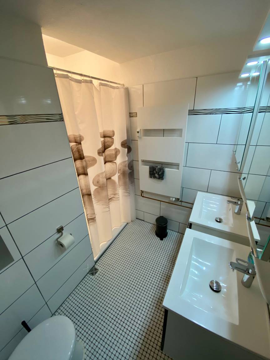 1. Sanitärraum mit Dusche, Toilette und Doppelwaschbecken, Regendusche, Thermostat, Handtuchheizkörper