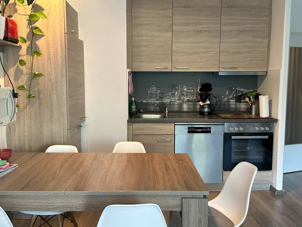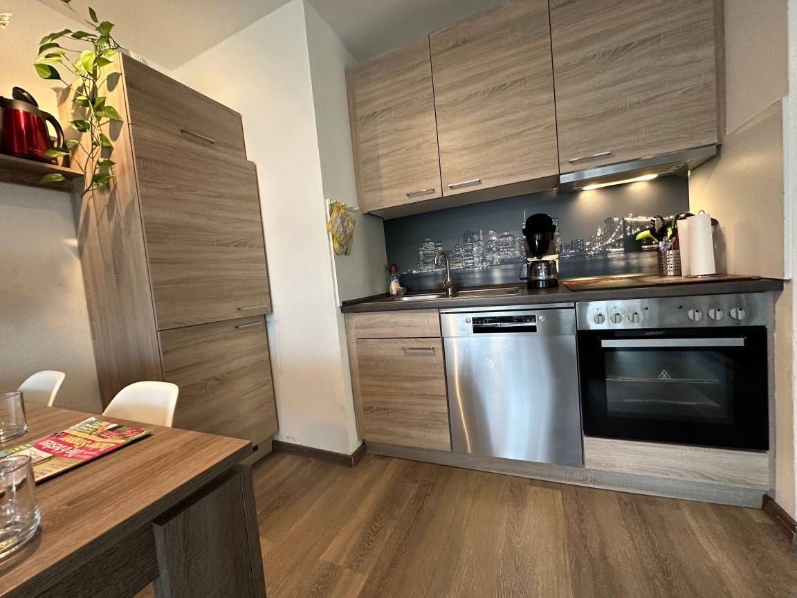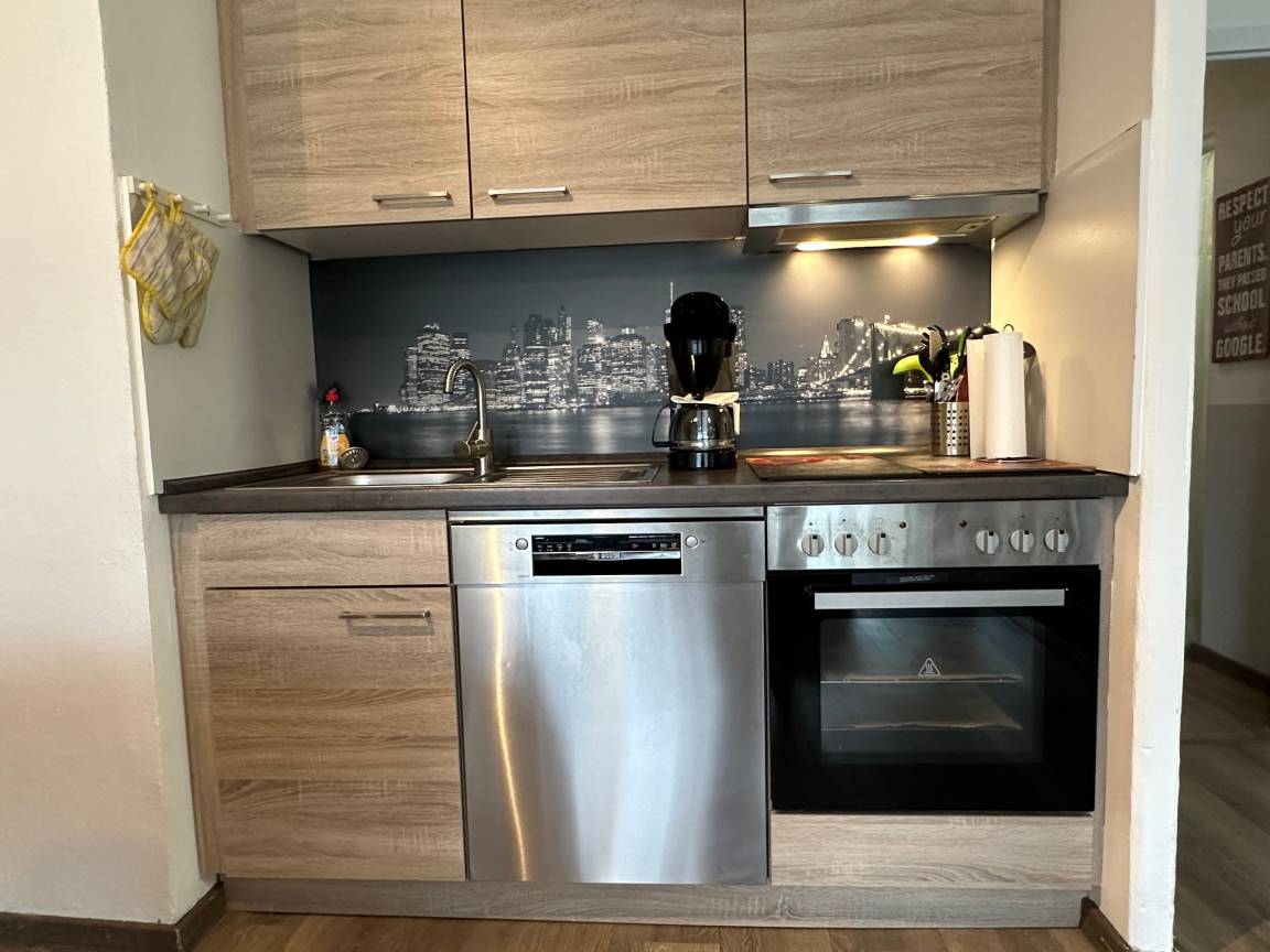 Gepflegte Küchenzeile mit Herd u.Backofen,gut ausgestattet mit vielen E-Geräten,Kühlschrank mit Eisfach, Geschirrspüler