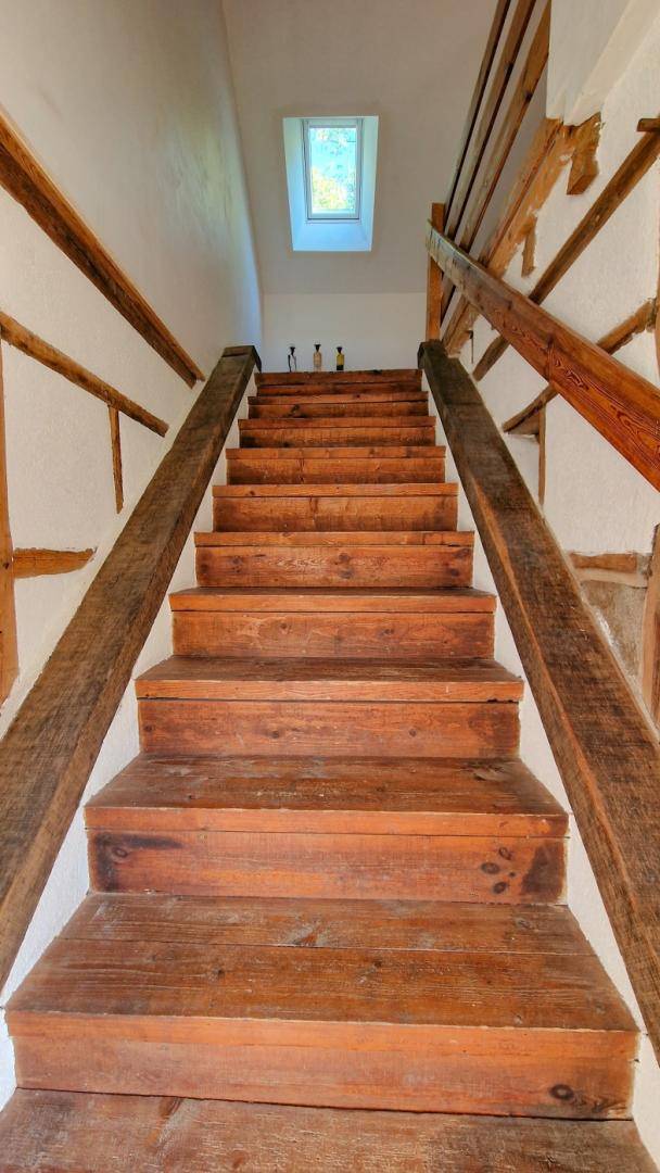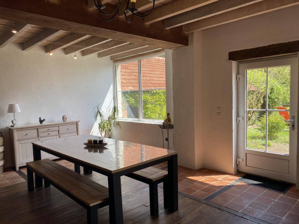 Erdgeschoss: Einbauküche, Wohnzimmer mit Esszimmer, Kamin mit großer Feuerstelle, Pelletofen. Genießen Sie ein großes helles Wohnzimmer, offen nach außen mit seinen großen Erkerfenstern mit Blick auf den Garten. "Gemütliche" und "warme" Atmosphäre, Boden mit schönen Terrakottafliesen und Parkett, französische Decke, 1 Schlafzimmer (2 Betten à 90 x 200 cm), separates WC, Abstellraum.