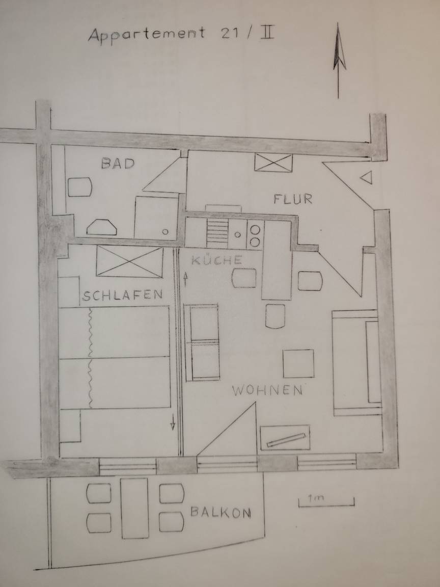 Die Ferienwohnung befindet sich im 2. Obergeschoß an der Südseite eines Ferienappartementhauses mit Tiefgarage und Fahrstuhl. Die Wohnung ist für 3 Personen in Familienformation, für 3 Jugendliche oder für 2 Erwachsene mit Kleinkind ausgelegt. Die Abtrennung zwischen Wohn-und Schlafbereich erfolgt durch ein Schiebewandsystem. Wir weisen darauf hin, dass diese Abtrennung nicht schallisoliert ist.
