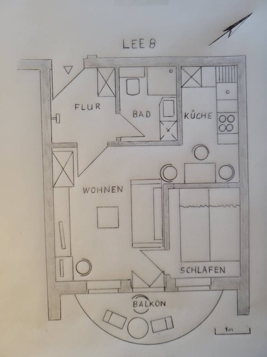 Die Wohnung ist für 3 Personen in Familienformation, für 3 Jugendliche oder für 2 Erwachsene mit Kleinkind ausgelegt. Es gibt auch einen kleinen Computerarbeitsplatz. Der Balkon zeigt in Richtung Süden und ist halb überdacht (Sonne bis ca. 13:30 Uhr).