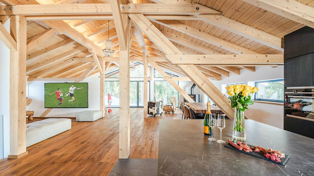 Haus: Einzigartiges Luxus-Chalet mit Sauna, Dampfbad und skandinavischem Hot-Tub. 5 Zimmer-Chalet mit 220 qm Wohnfläche über 2 Etagen. 2 Wohnräume, 3 Schlafräume, 3 Bäder! Zentrum des Hauses ist der großzügig bis in den Dachgiebel ausgebaute Wohnraum mit großer Panoramafensterfront. Moderne, sehr hochwertige Komfort-Ausstattung. Internet über W-Lan. Smart-TV, Home-Cinema mit Beamer, Dampfbad. Waschmaschine, Trockner. Fußbodenheizung. Balkon (Sitzmöbel). Terrasse mit Panorama-Außensauna, typisch-skandinavischem Hot-Tub. Parkhaus und Parkplätze im Ort (Gebühr, Reservierung empfohlen).