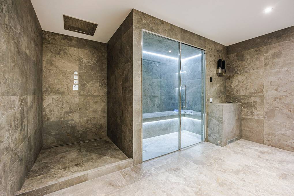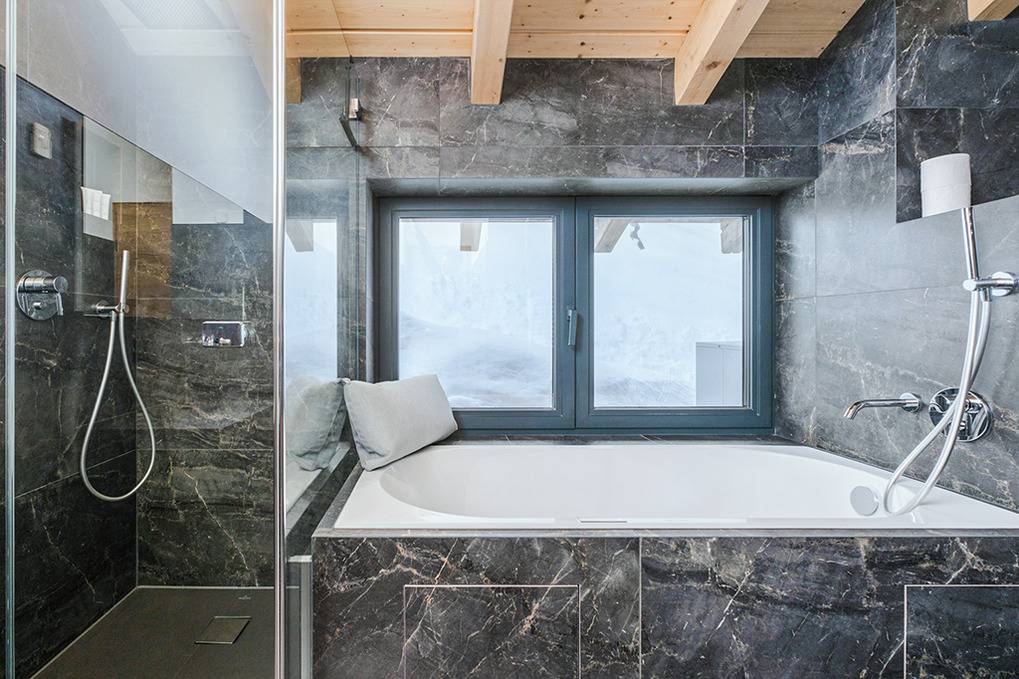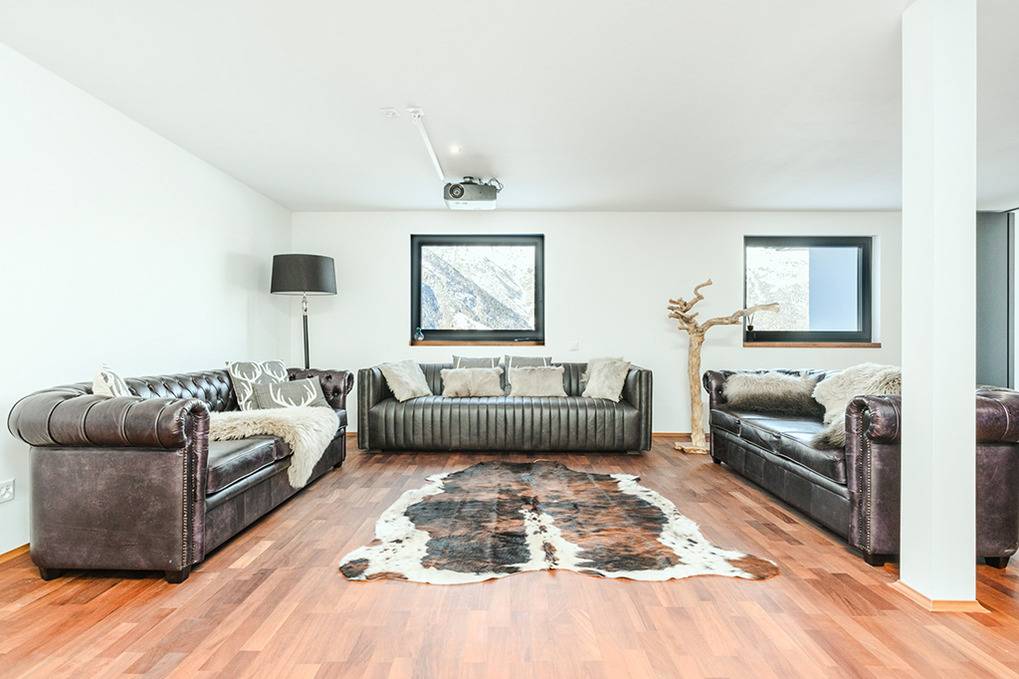 Parterre: Weiterer Wohnraum mit Sofa-Sitzecke, Home-Cinema (Beamer). Großes Doppelzimmer mit freistehender Badewanne vor großen Panoramafenstern (herrlicher Bergblick). Zwei weitere schöne Doppelzimmer. Bad: Dusche, Wb, WC. Weiteres Bad mit Dusche, großem Dampfbad. Zugang zur Terrasse mit Sitzmöbeln, Panorama-Sauna, Hot-Tub-Whirlpool.