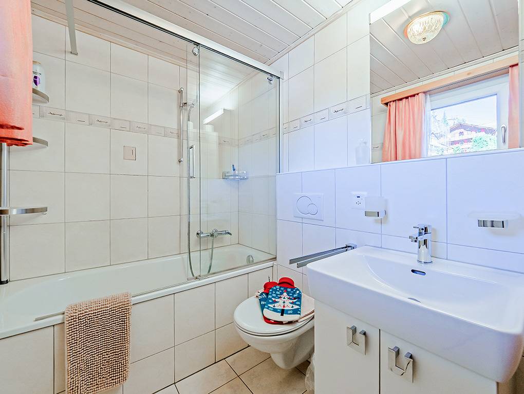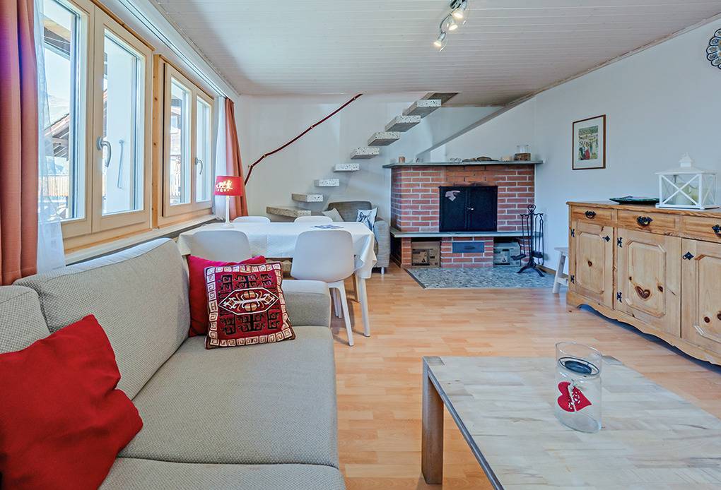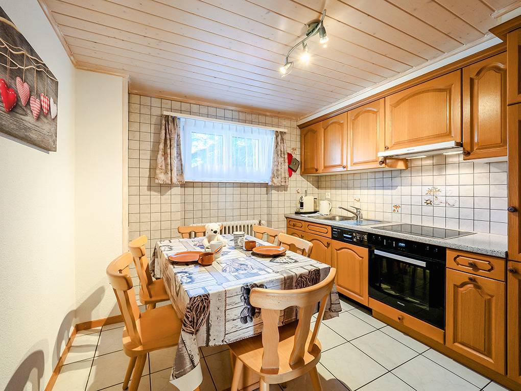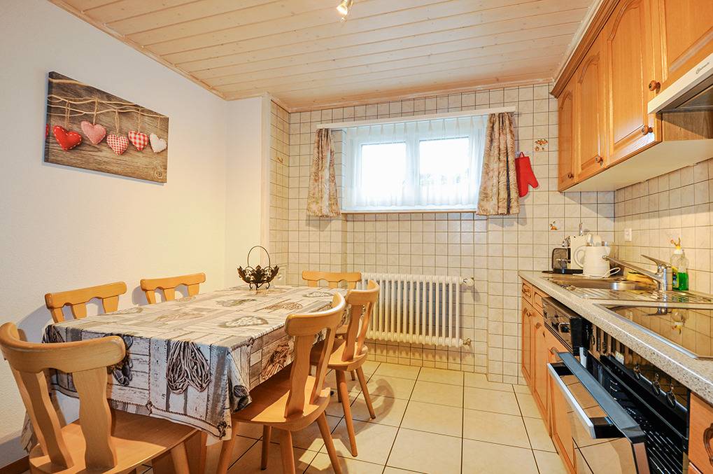 Parterre: Windfang mit Garderobe. Wohn-/Essraum mit gemütlicher Sofa-Ecke, Kamin, Smart-TV, Blu-Ray, Esstisch, Balkon (schöner Bergblick). Separate Küche mit weiterem Esstisch, Küchenzeile (Backofen, Mikrowelle, Spülmaschine). Separates WC.