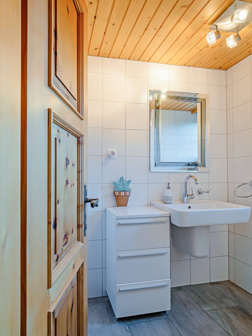 Parterre: Windfang mit Garderobe. Doppelzimmer mit Bad (Bw, Wb, WC). Weiteres Doppelzimmer mit Bad (Dusche, Wb, WC). 2-Bettzimmer mit Etagenbett. Saunabereich mit Dusche.
