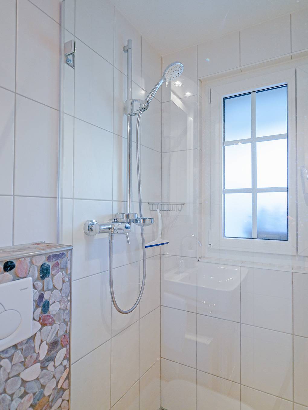 1. Etage: Sehr schöner, bis zum Dachgiebel ausgebauter Wohnraum (60 qm) mit umlaufenden Panoramafenstern, gemütlicher Sofa-Sitzgruppe, Kamin, Sat-TV, Esstisch, gut ausgestatteter Einbauküche (Backofen, Mikrowelle, Spülmaschine), Balkon. Doppelzimmer. Separates WC.