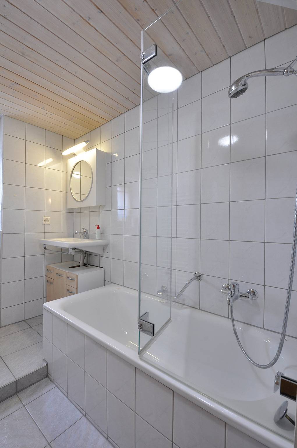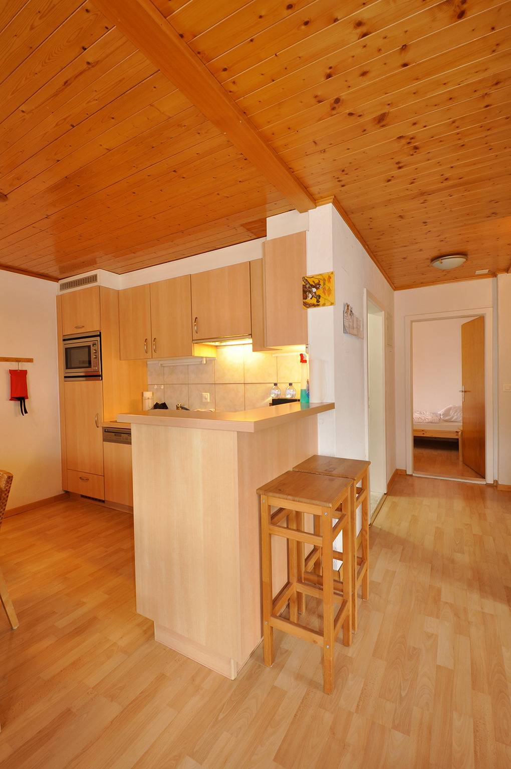 CH 310.15 Chaletwohnung 2-6 Pers.: 4-Zimmerwohnung mit 85 qm Wohnfläche über 2 Etagen. Parterre: Windfang mit Garderobe. Doppelzimmer. Bad: Du, Wb, WC. Schmale Treppe in die 1. Etage: Wohn-/Essraum mit gemütlicher Sofa-Ecke, gr. Flachbild-TV, Radio/CD, Esstisch, thekenartig abgetrennter Einbauküche (Backofen, Mikrowelle, Spülmaschine), großem Balkon (Sitzmöbel, schöner Bergblick). Doppelzimmer. 2-Bettzimmer. Bad: Bw/Du, Wb, WC.