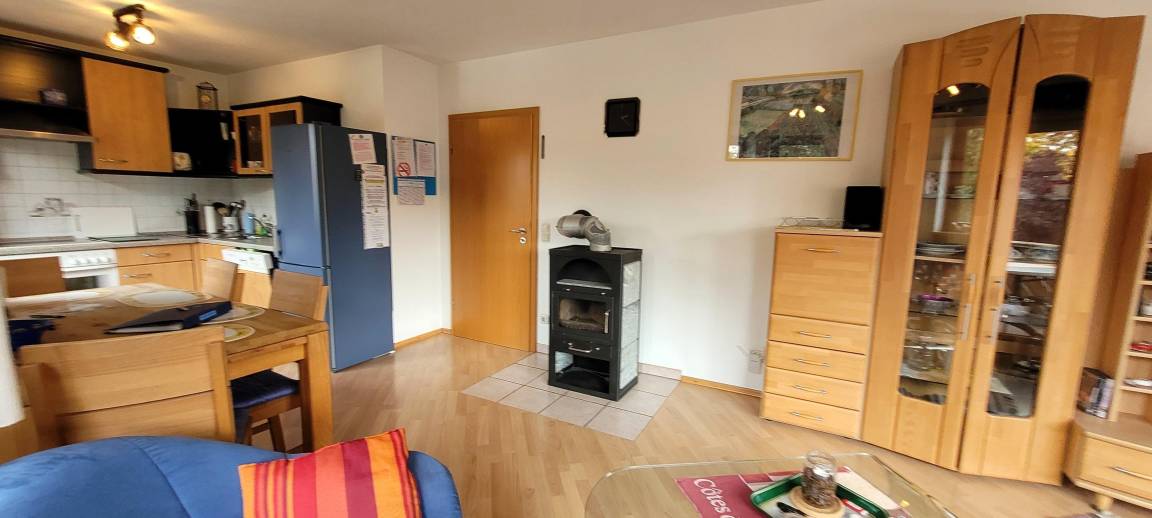 große Glasschiebetüre z. Balkon (Rolladen elektrisch) , Specksteinofen.