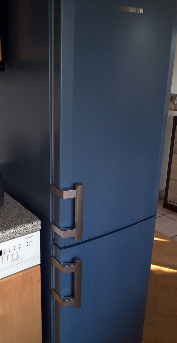 -Kochen: Einbauküche mit Herd+Ceran, blauer Stand-Kühl/Gefrierschrank, Spülmaschine,