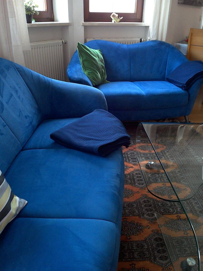 -mit Zweisitzer-Couch + Recamiere -in blauem Velour-, Wohnwand, Tisch.