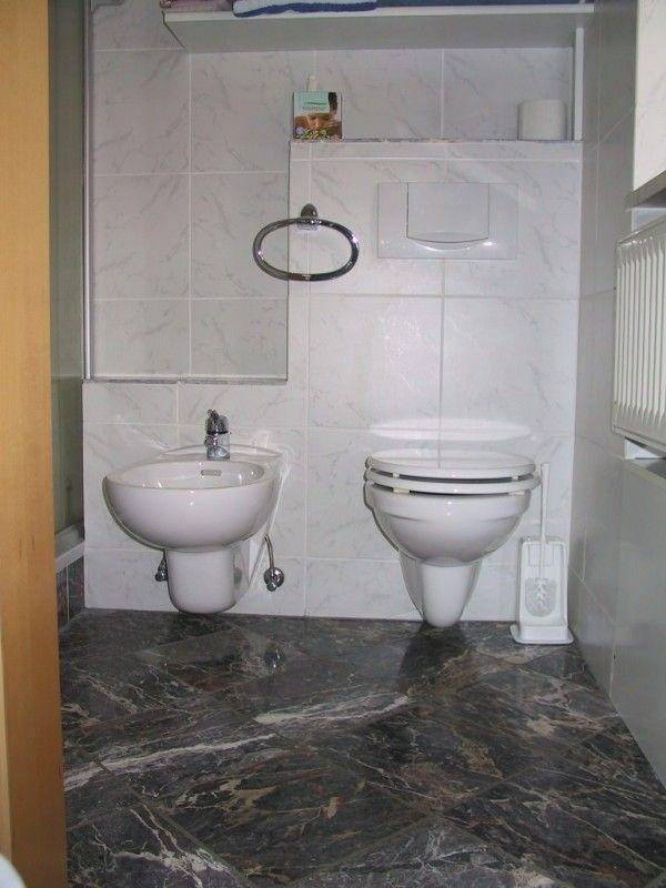 -helles Dusch-Bad mit WC, Bidet, Badschrank, hell gefließt, Marmorboden,