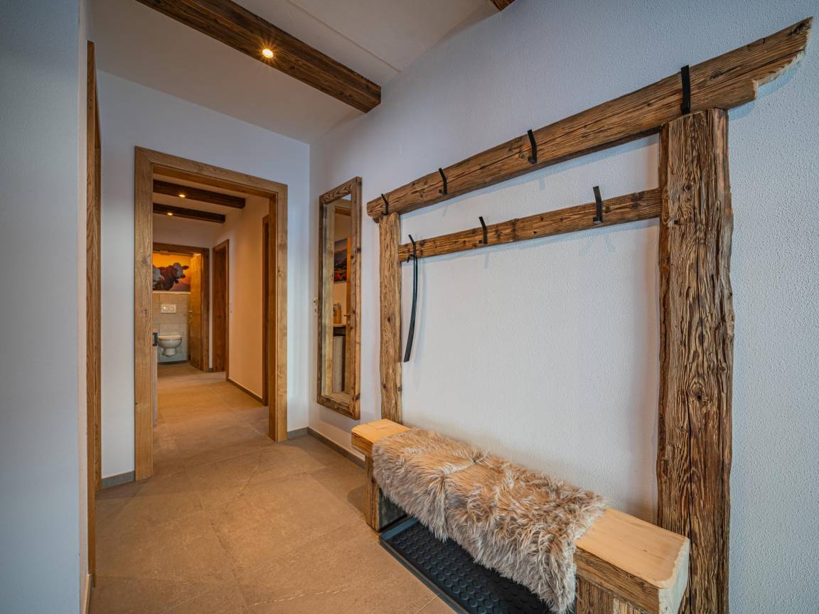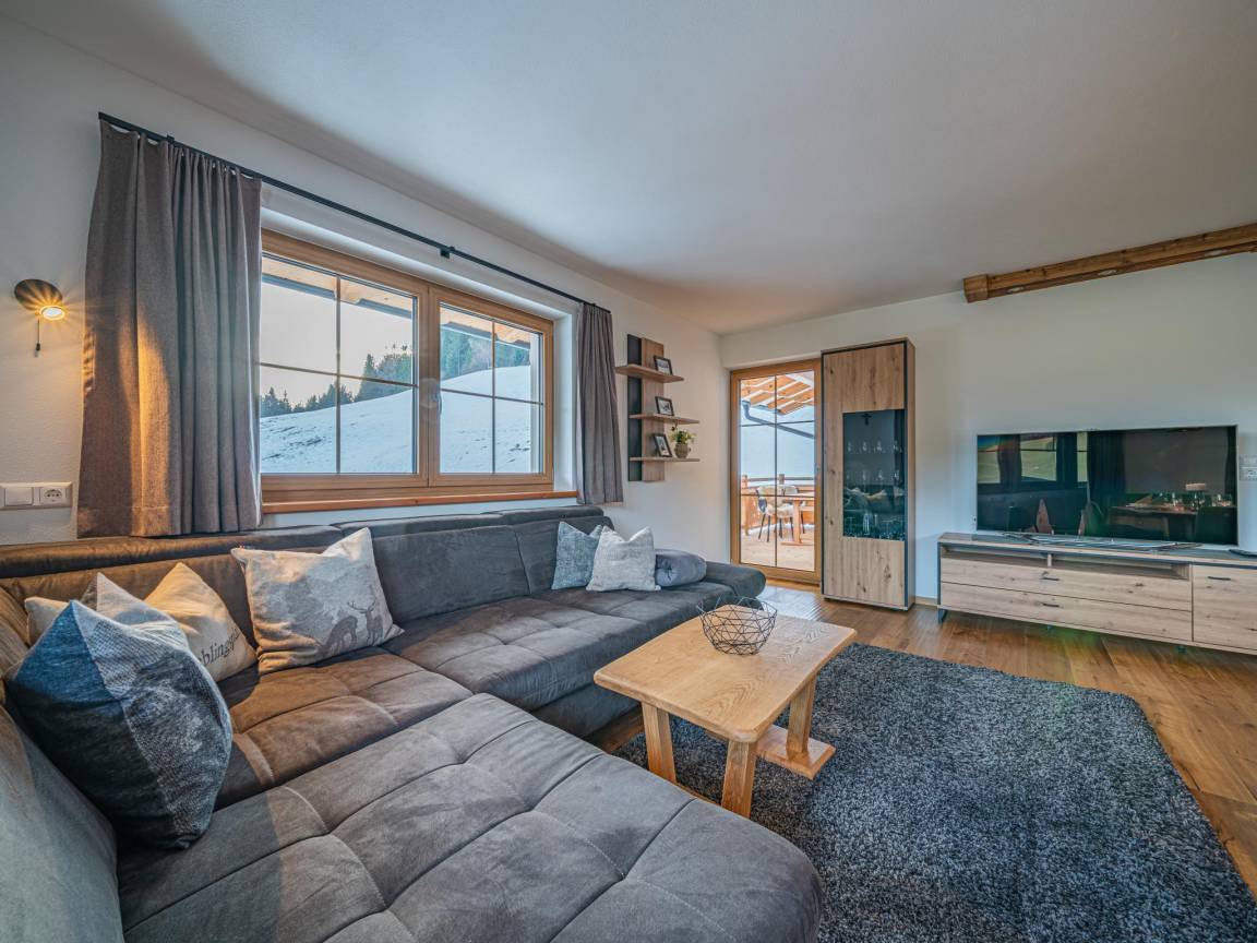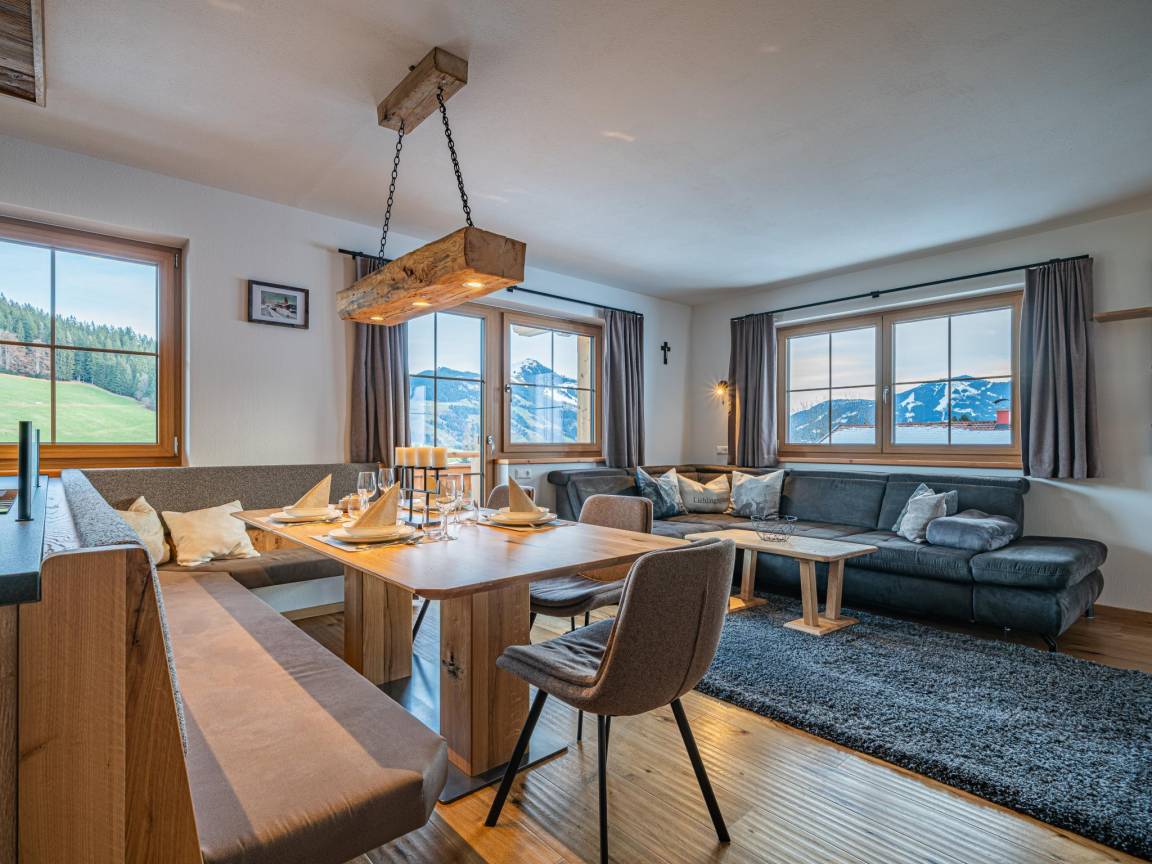 Hausbeschreibung : Die moderne Ferienwohnung im 2. Stock bietet alpinen Charme und viel Komfort für Familien. Zur Wohnung gehört ein Schlafzimmer mit Doppelbett; ein weiteres, separates Schlafzimmer liegt außerhalb der Wohnung im Flur und ist privat nutzbar. Ein Wohn-Essbereich mit Doppelschlafcouch, TV und offener Küche sowie Fußbodenheizung schaffen eine gemütliche Atmosphäre. Der Balkon bietet Bergblick und Privatsphäre