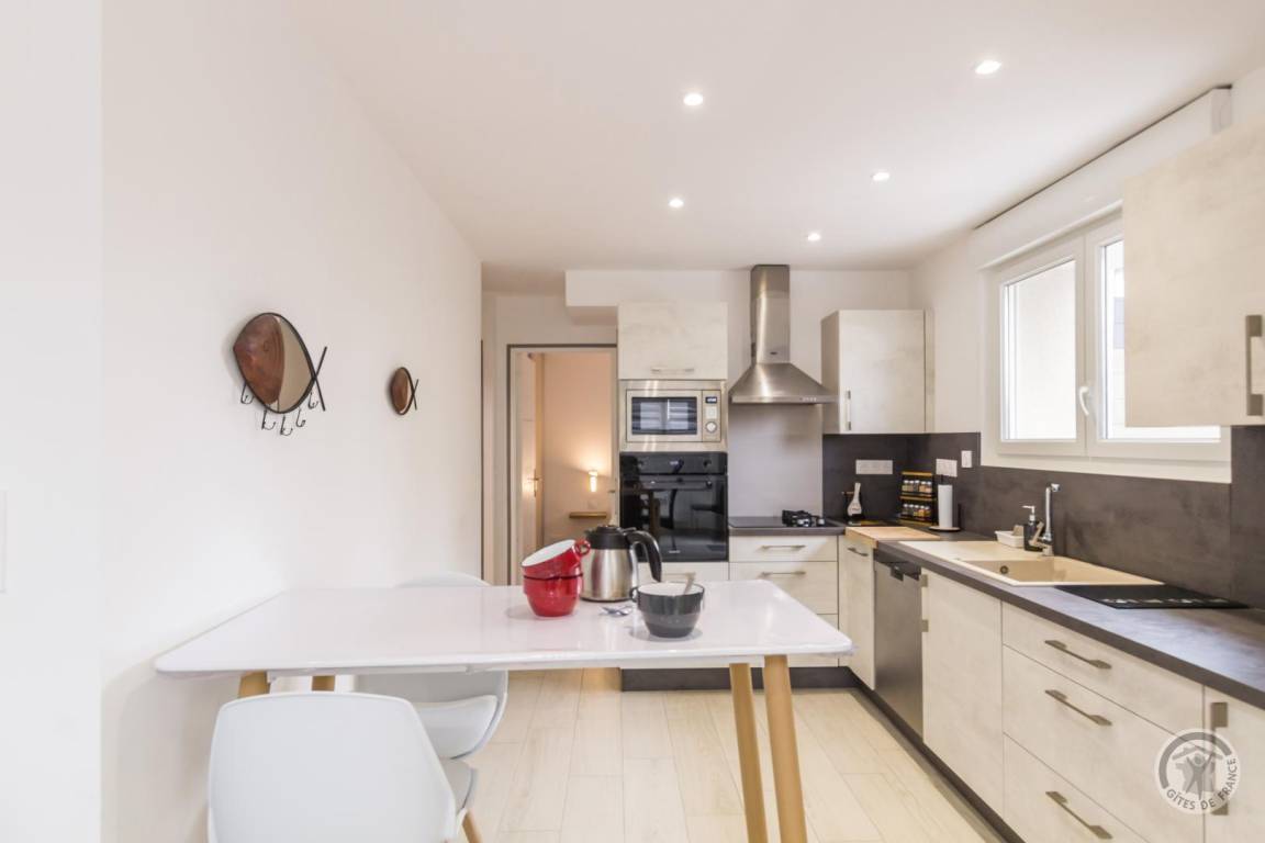 „Le logement est assez grand, tres bien équipé pour le coin cuisine. Il y a une contre allée juste devant assez pratique pour décharger son véhicule, il faut se garer en face sur parking sans difficulté au quotidien. La route est en revanche assez fréquenté donc parfois bruyante. Mauvaise surprise sur les poubelles grises à emmener à 700 Mètres (700 et pas 70), je n ai jamais vu ça alors que les voisins ont des bac gris à roulette. La dimension de la literie ne semble pas correspondre au sommier dans une chambre, ce qui n est pas très très confortable.“