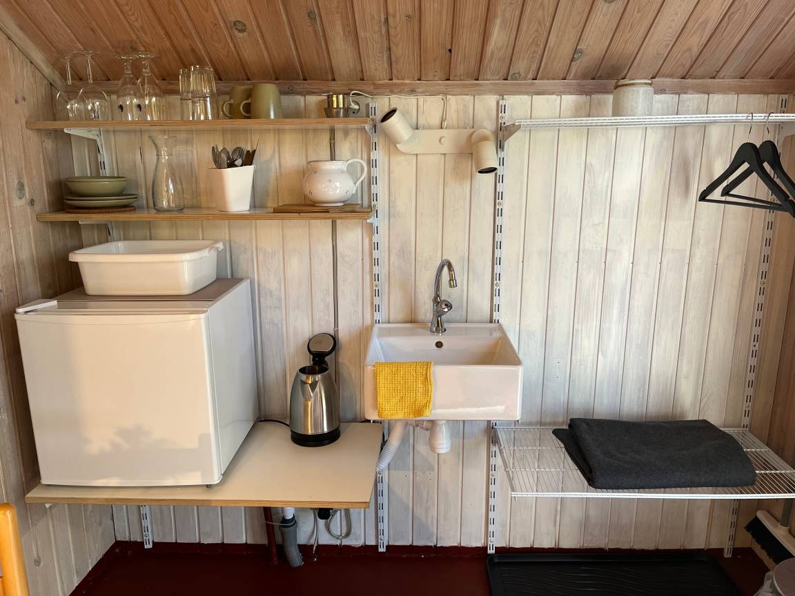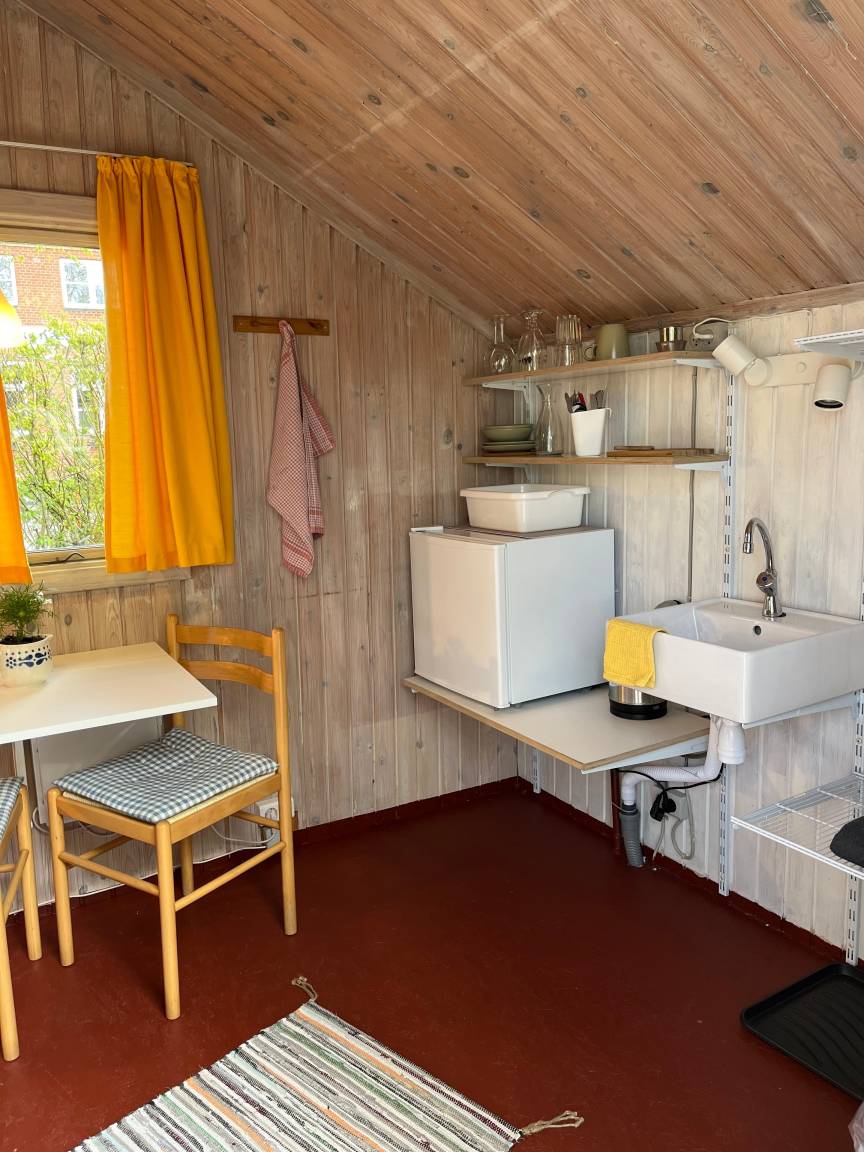 Rinkenæshus Camping Hytter A, gemütlich gelegen auf der Hyttenwiese, ist ausgestattet mit Außenterrasse, bezogenen Betten, Sitzecke, Waschbecken (nur kaltes Wasser), Wasserkocher, Kaffeebrüher, Geschirr & Kühlschrank. WLan Gratis.