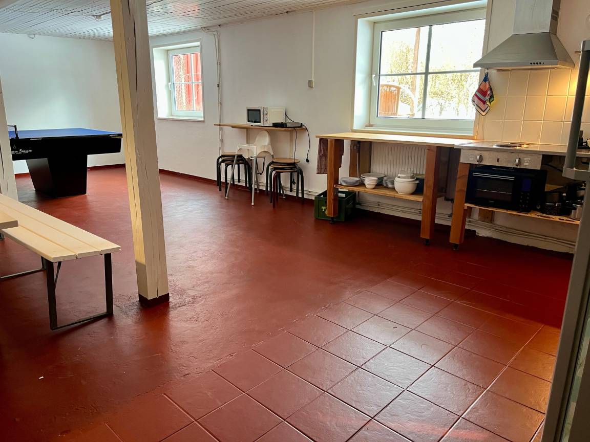 Die Duschen und Toiletten, das Familienbad mit Wickelplatz, sowie die Gemeinschaftsküche mit Billardtisch/Tischtennisplatte befinden sich im Haupthaus (im Souterrain).