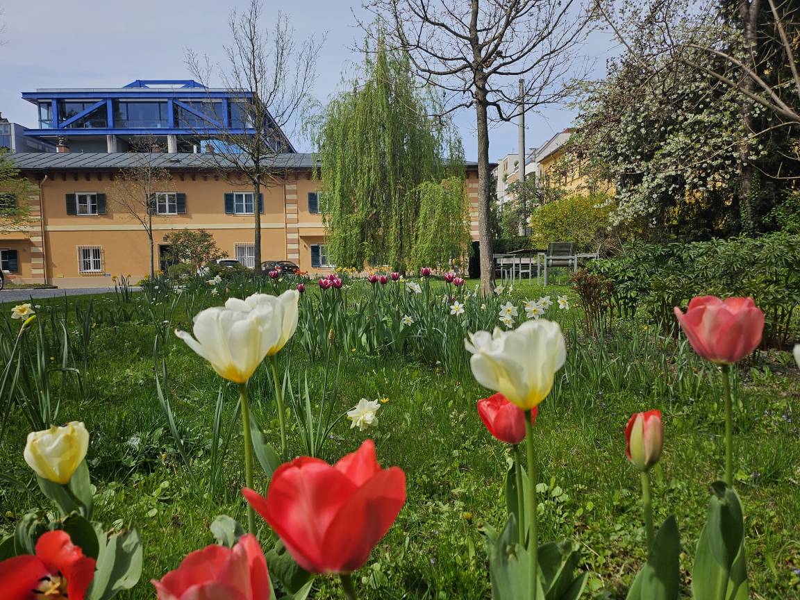 Das blaue Schlafzimmer schaut in Richtung Garten der Villa, von der Wohnküche und dem grünen Schlafzimmer sieht man zum Eingang der ReSoWi (Rechts-Sozial- Wirtschaftswissenschaften) der Universität Graz.