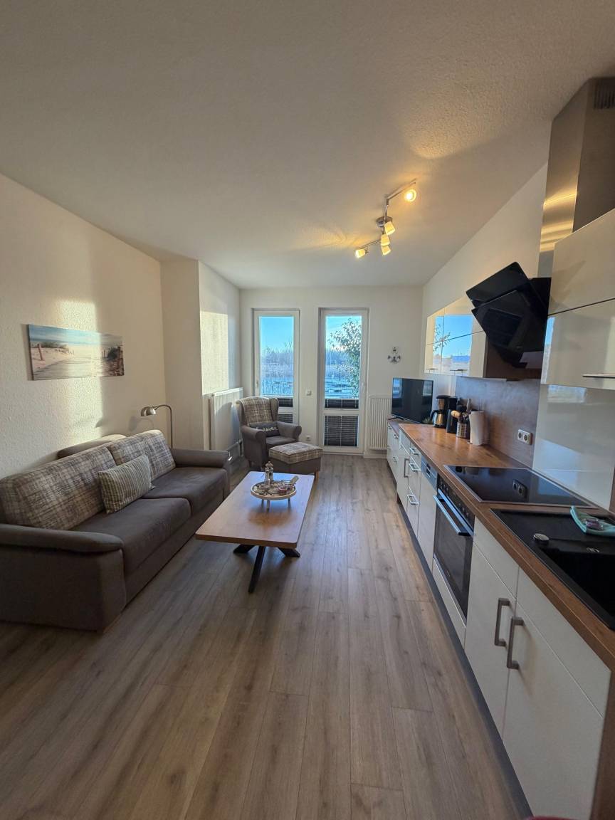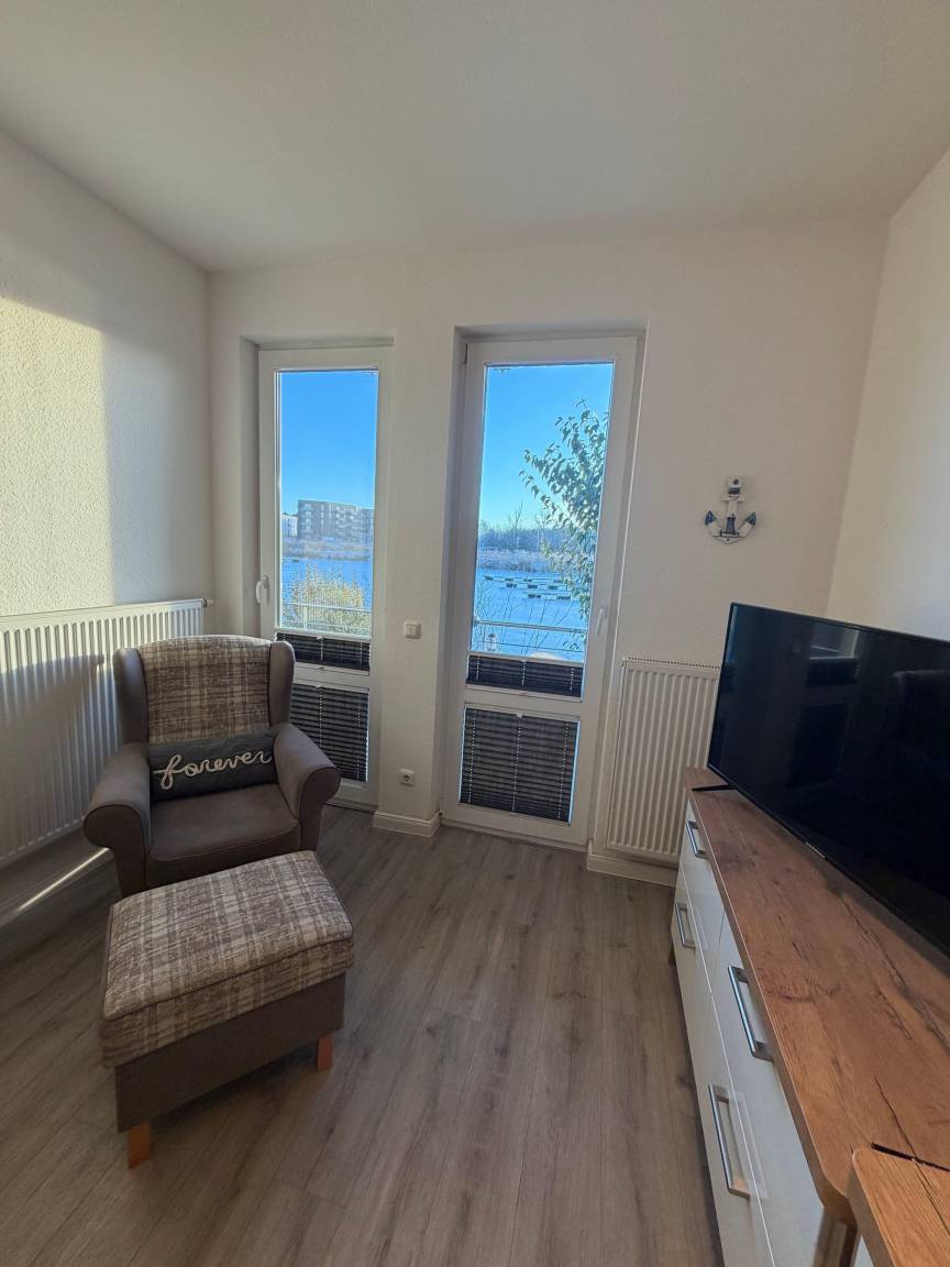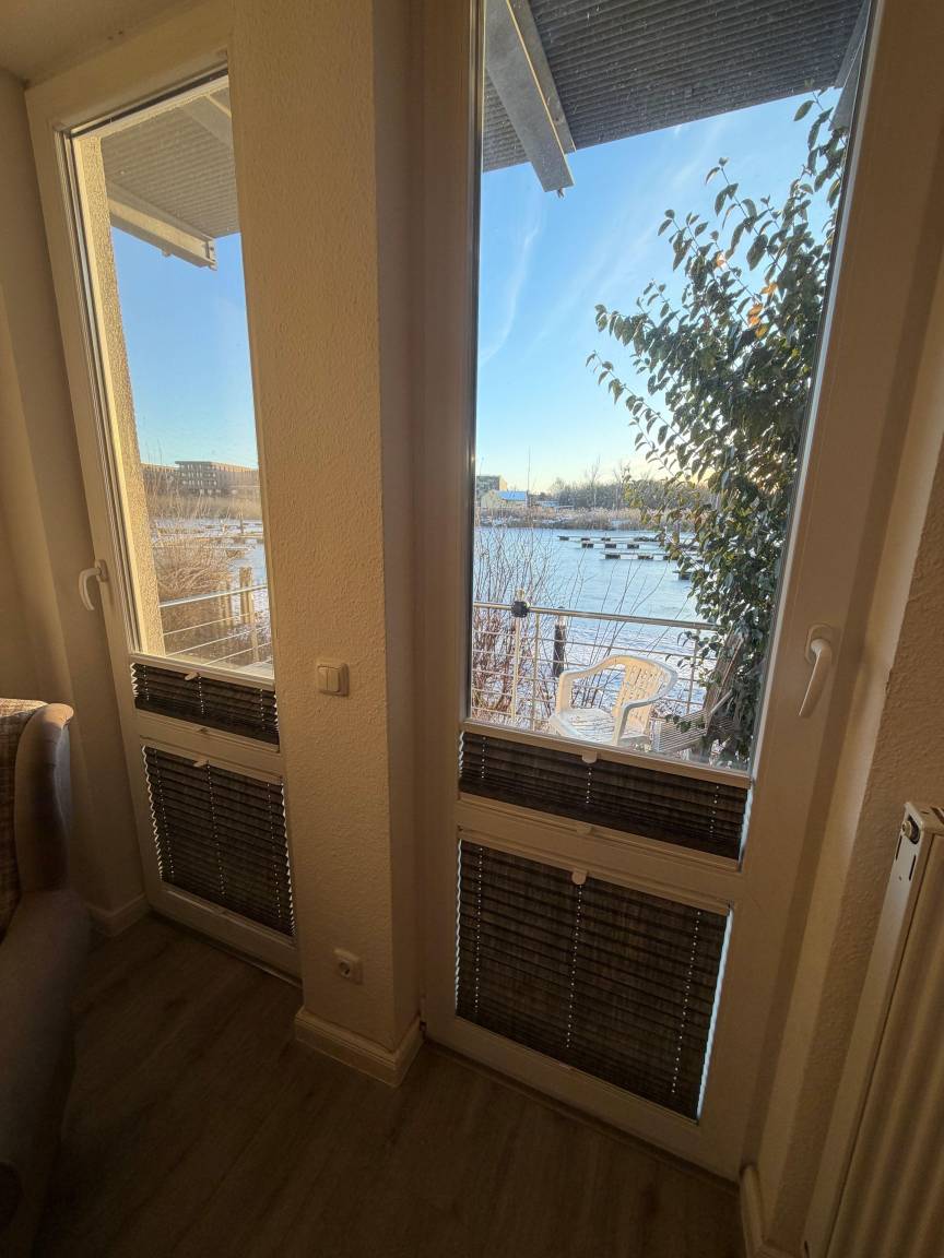 direkter Blick zum Seglerhafen, Terasse zum Wasser nach Süden gerichtet.
