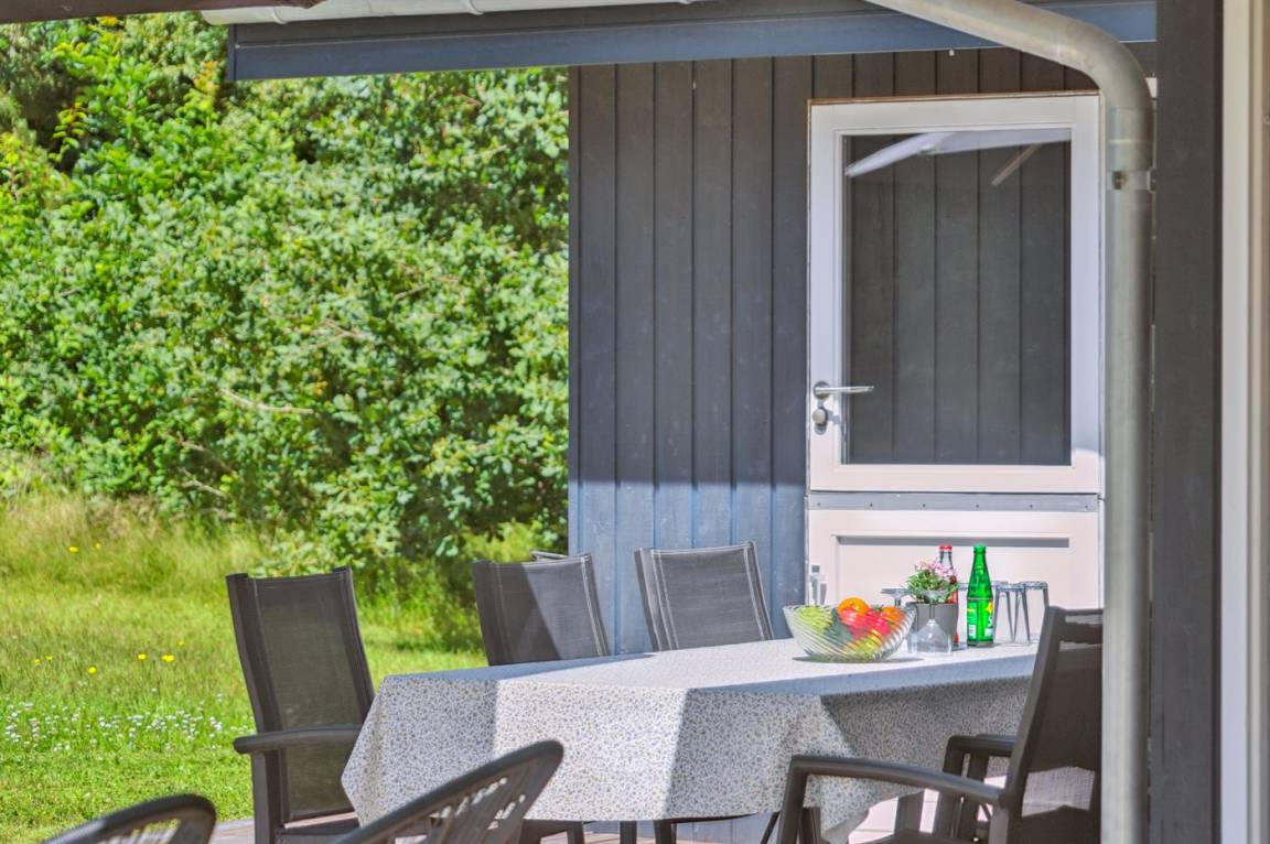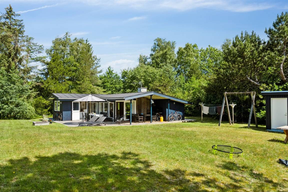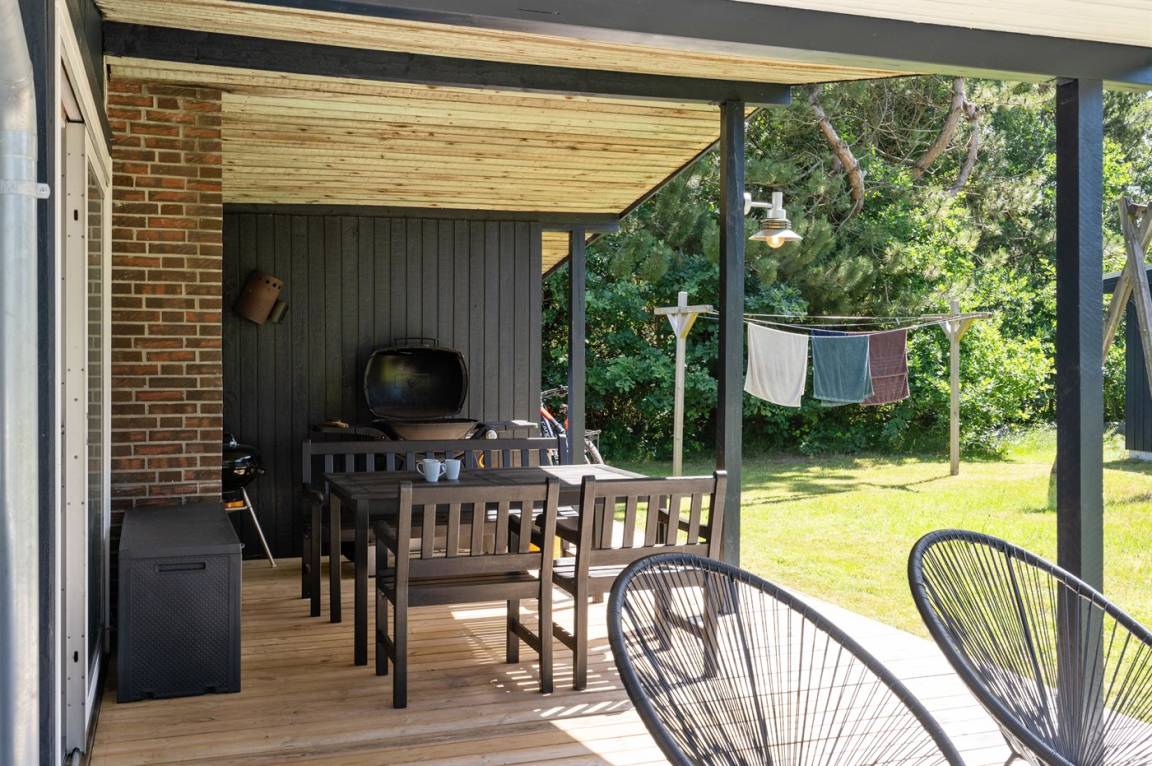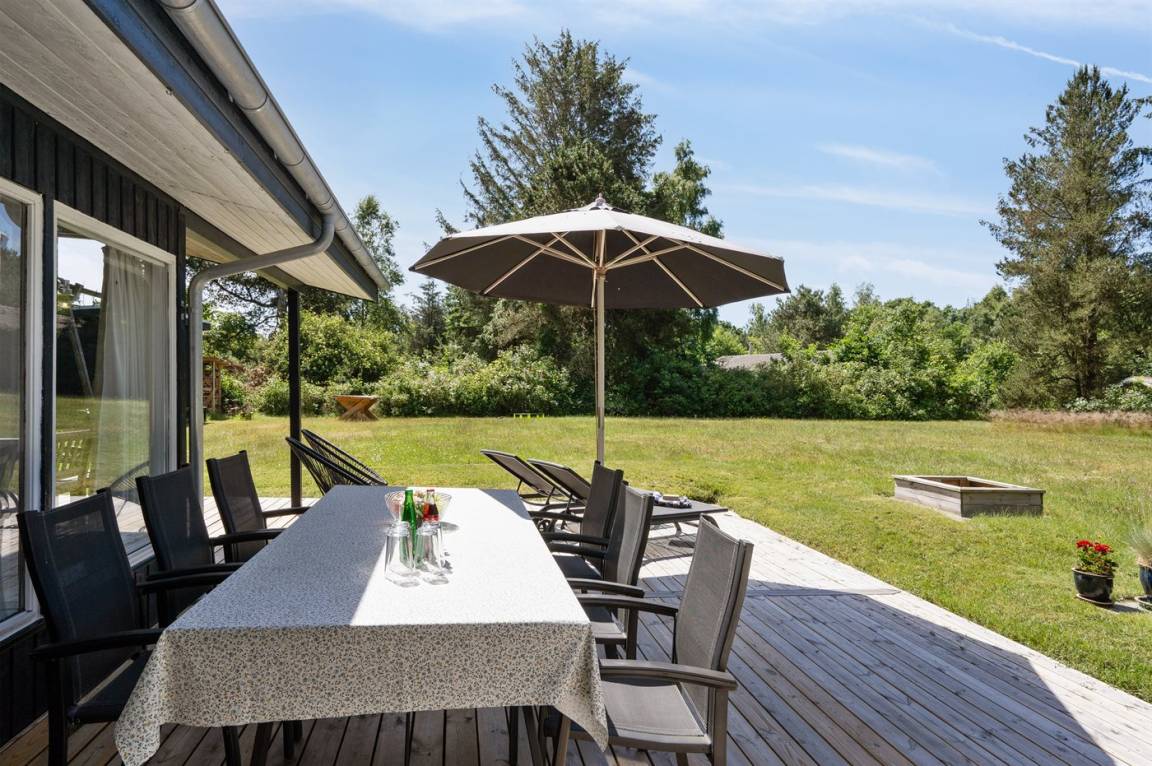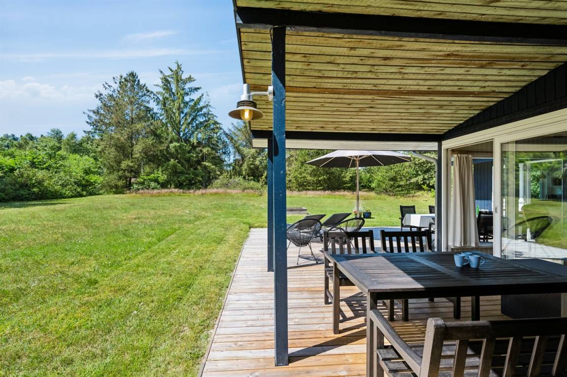 Das Ferienhaus verfügt über eine fantastische und große Terrasse, die teilweise überdacht ist. Hier hast du gute Möglichkeiten, Stunden im Freien zu verbringen, wo du ein Glas Wein, eine Tasse Kaffee genießen oder dich mit einem guten Buch entspannen kannst. Die Lage ist völlig ungestört, sodass du die Umgebung in Ruhe genießen kannst. Auf dem großen Grundstück gibt es viel Platz für Ballspiele und andere Aktivitäten um Freien.