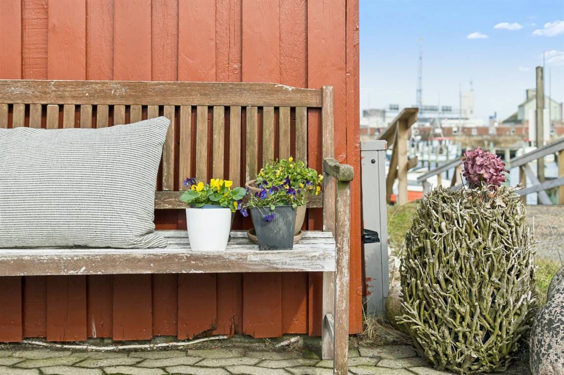 Freie Terrasse mit Blick über den Yachthafen. Gemütlich und charmant eingerichtet mit einer gut ausgestatteten Küche im Erdgeschoss sowie einem warmen und hellen Wohnzimmer im Obergeschoss.