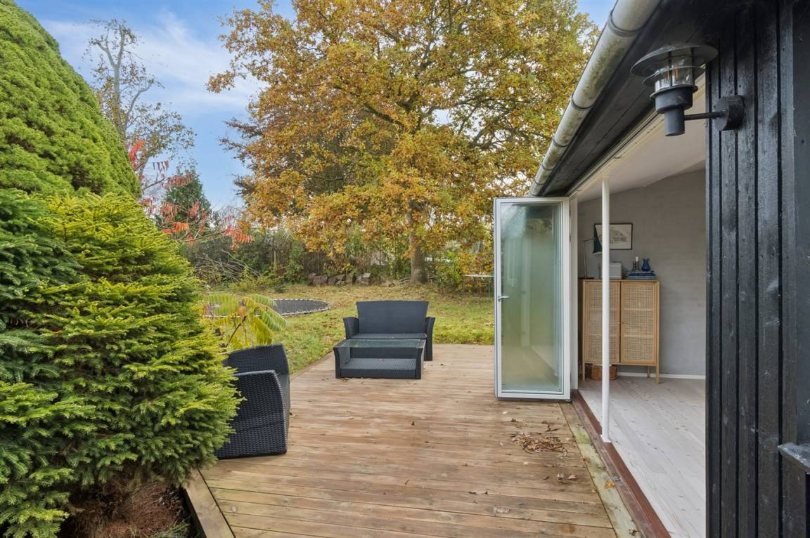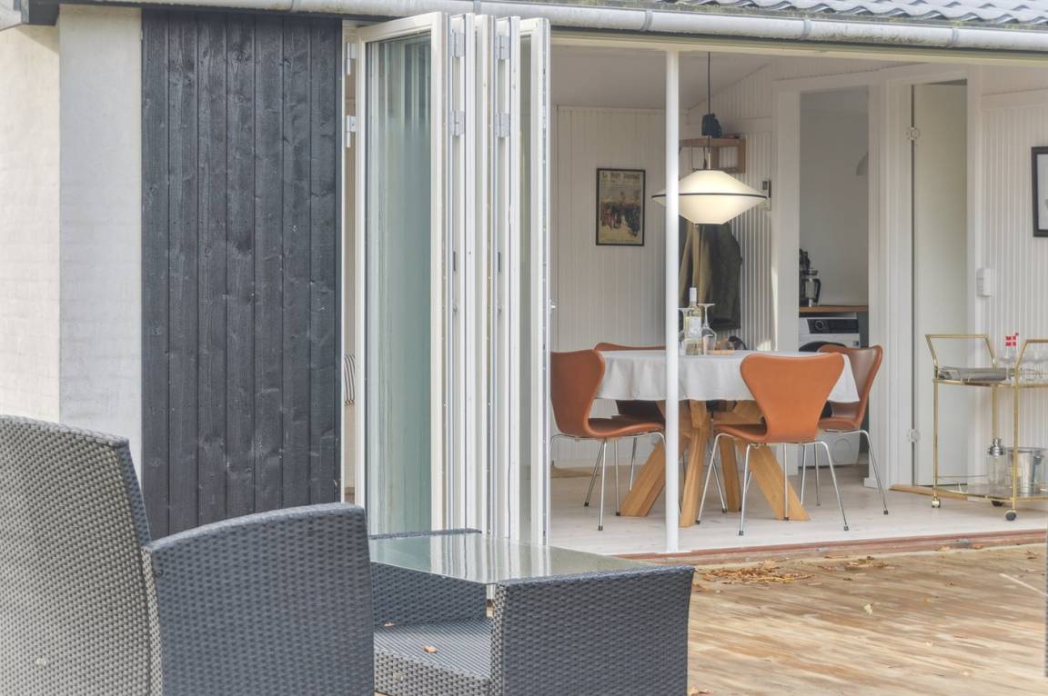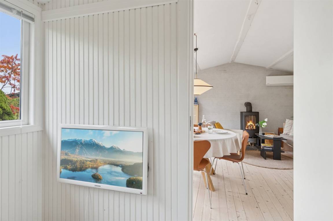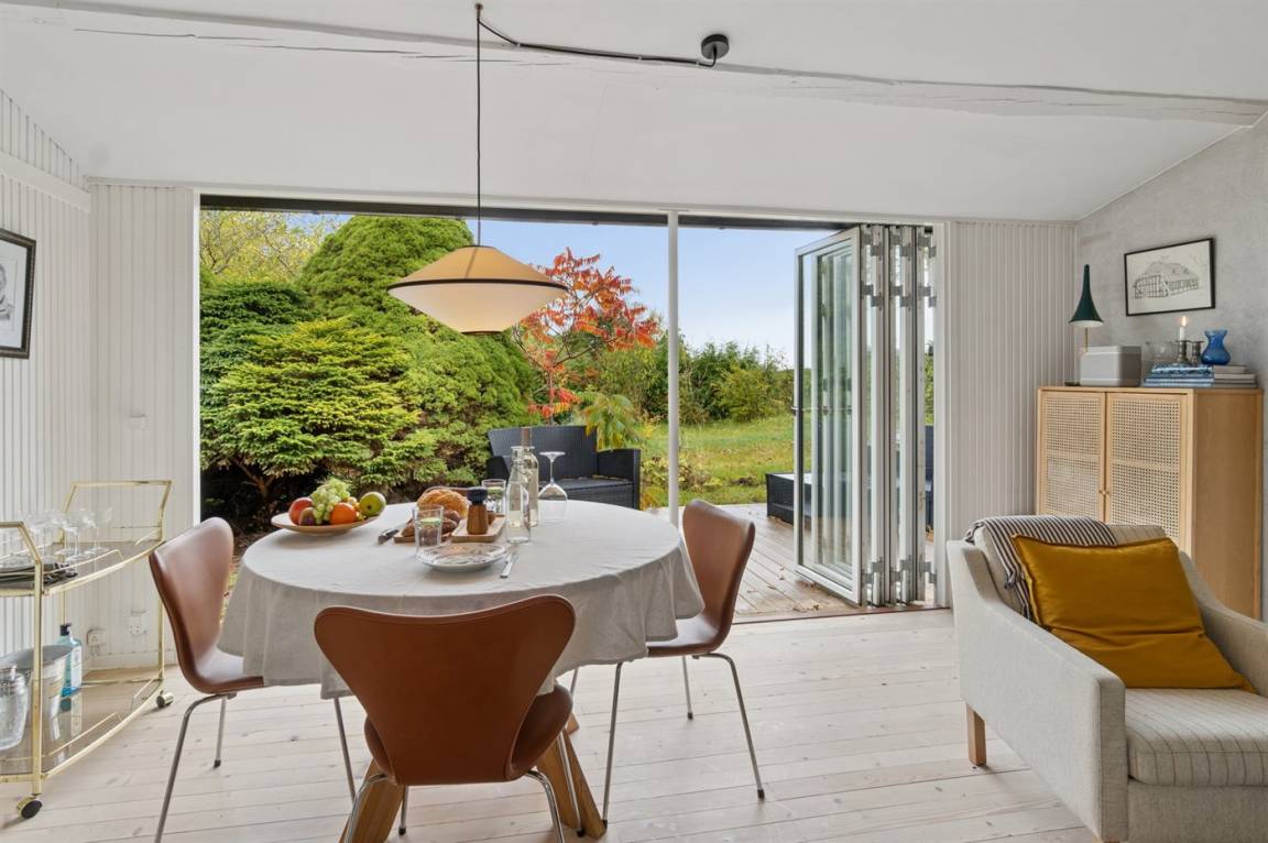 Das Haus verfügt über eine schöne Küche in offener Verbindung mit dem Wohnzimmer und dem Essbereich. Das große Fenster im Wohnzimmer kann geöffnet und zur Seite geschoben werden, sodass das Leben im Freien nach innen geholt wird und du freien Zugang zur Terrasse hast. Rund um das Haus gibt es schöne Terrassen und eine attraktive Bepflanzung, die dazu einlädt, draußen zu sein und die Sonne sowie das gute Wetter zu genießen.