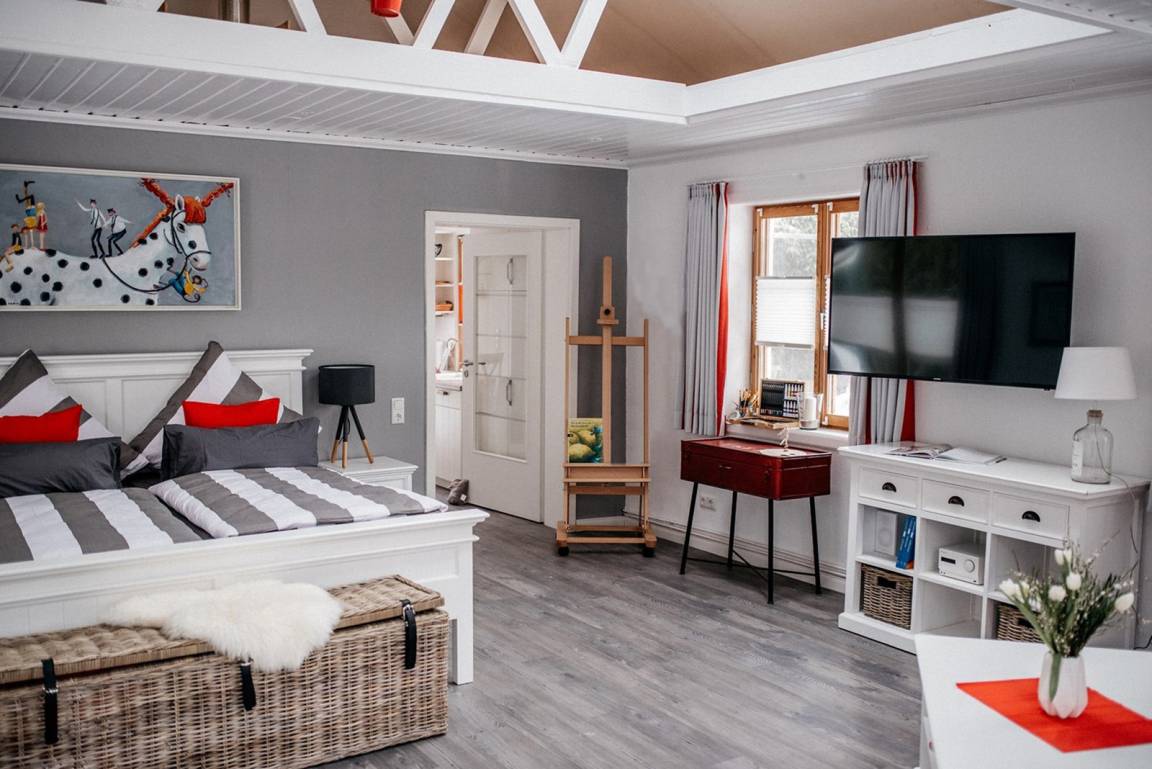 Einen virtuellen 360° Rundgang durch unseren "Kleinen Onkel" können Sie hier starten: Das kleine, aber feine Ferienhaus "Kleiner Onkel" ist die perfekte Ferienunterkunft für Ihren Urlaub zu zweit. Die Räumlichkeiten sind barrierefrei gestaltet, so dass auch Rollstuhlfahrer oder Personen mit eingeschränkter Mobilität Ihren Urlaub an Ostsee und Schlei genießen können. Die Einrichtung ist im skandinavischen Stil gehalten, und liebevolle Details sorgen für eine heimelige Atmosphäre. Der kombinierte Wohn- und Schlafraum ist mit einem kuscheligen Doppelbett, komfortabler Sitzgelegenheit und einem Flachbild-TV ausgestattet. Die Küche ist modern und gut ausgestattet. Hier haben Sie die Möglichkeit, gemeinsam tolle Gerichte zu zaubern. Diese können Sie dann an dem kleinen Esstisch in der Küche oder bei Sonnenschein draußen auf der Terrasse, zu der Sie von der Küche aus direkten Zugang haben, genießen. Das Badezimmer ist barrierefrei, und die Dusche hat einen eingebauten Duschstuhl. Auch neben dem WC sind Halterungen angebracht. Zusätzlich verfügt das Haus über kostenfreies WLAN sowie einen PKW-Parkplatz.