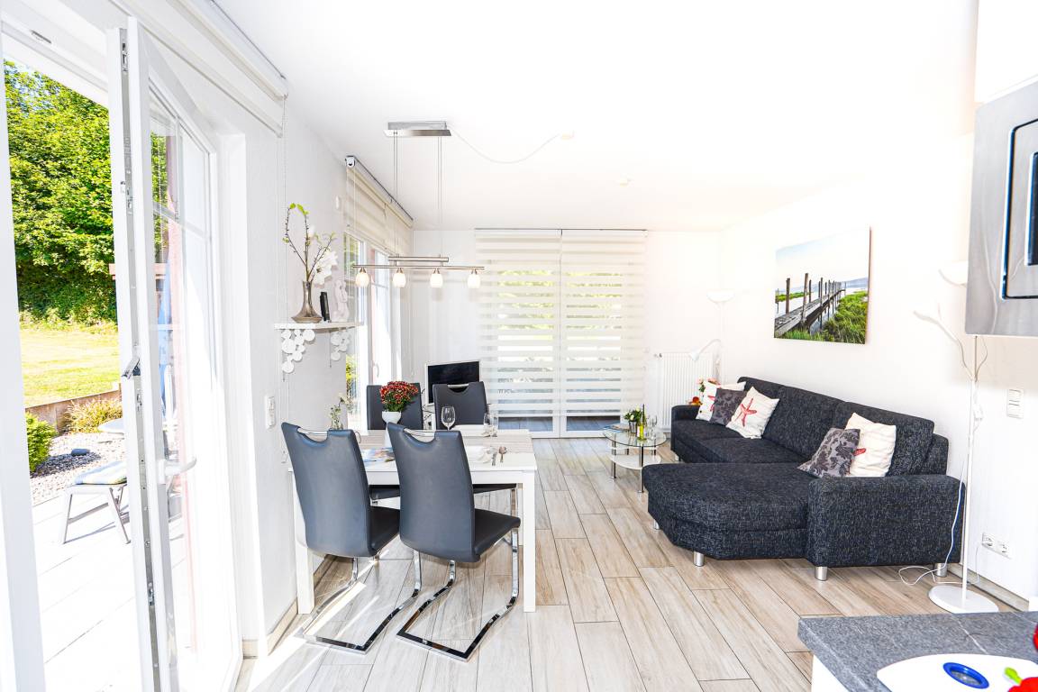 Im lichtdurchfluteten Wohnzimmer mit Sofa und Esstisch stehen Ihnen ein Fernseher und eine Stereoanlage zum Ausklingen des Tages zur Verfügung. Die stilvolle und offene Küche ist mit allen erforderlichen Geräten wie bsp. Backofen, Cerankochfeld, Spülmaschine und Kühlschrank mit Gefrierfach ausgestattet. Angrenzend an den Wohnbereich befindet sich die Terrasse, welche zum gemütlichen Beisammensein einlädt.
