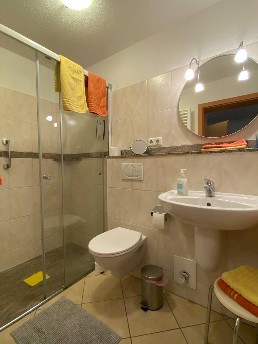 Im hell gefliesten Bad ist eine begehbare Dusche mit Glasschiebetür, Waschbecken und WC.