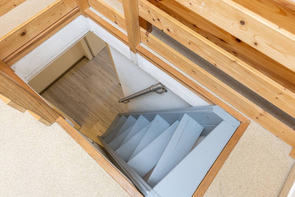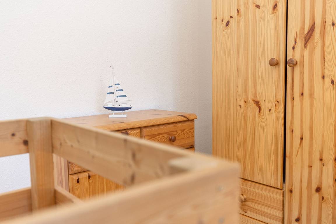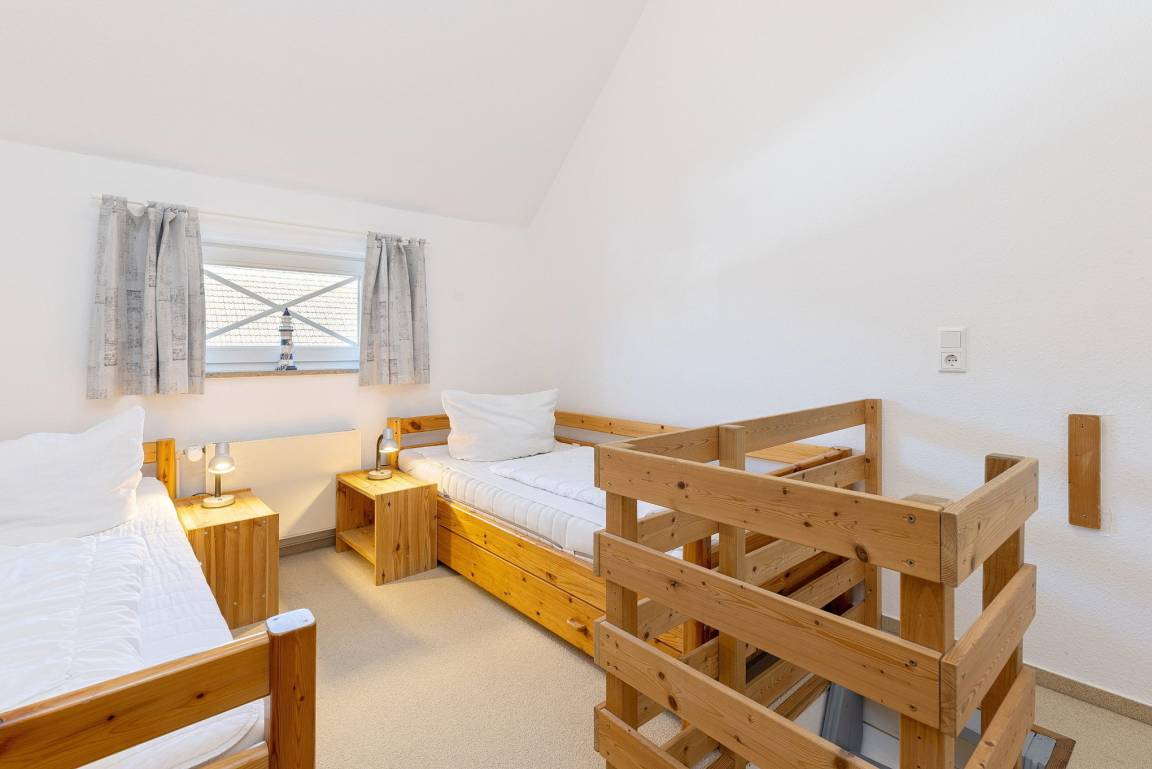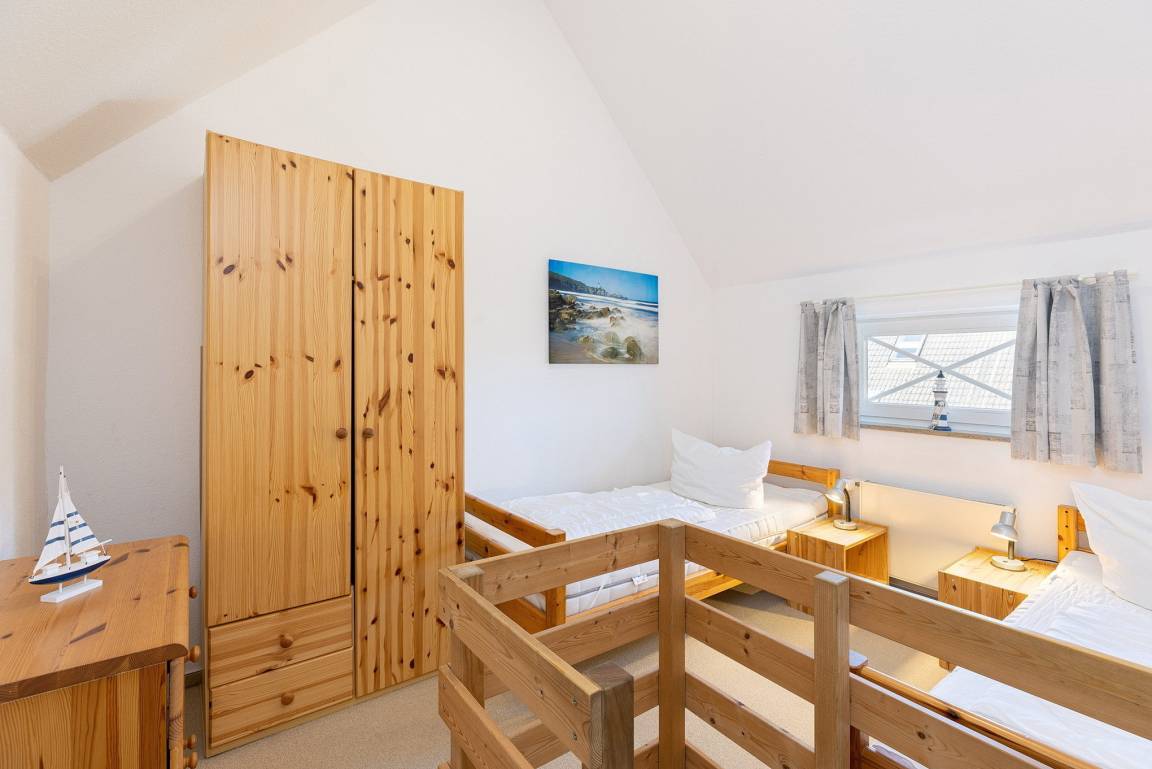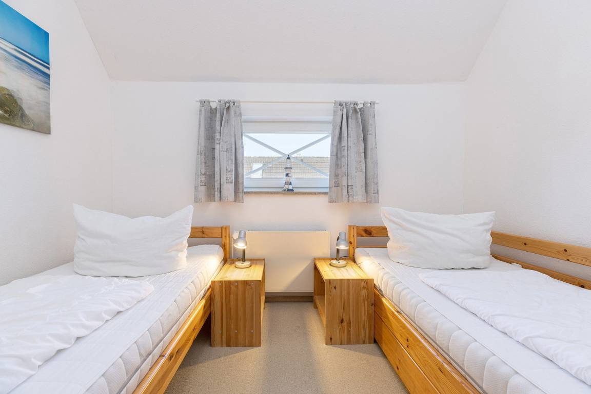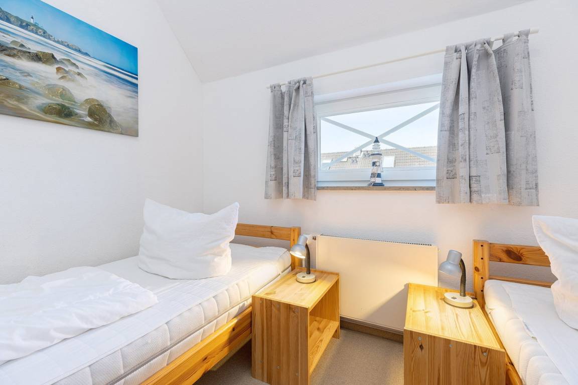 Freundliches, modernes und Anfang 2026 renoviertes Zimmer im 2.OG. Das Schlafzimmer ist über eine steile und sehr geräuscharme Raumspartreppe erreichbar. Das Schlafzimmer ist mit 2 getrennten Betten (90x200cm), einem Design-Tisch sowie einem großen Kleiderschrank ausgestattet. Das Zimmer ist mit Designboden ausgestattet. Das Fenster lässt sich durch einen blickdichten Vorhang verdunkeln.