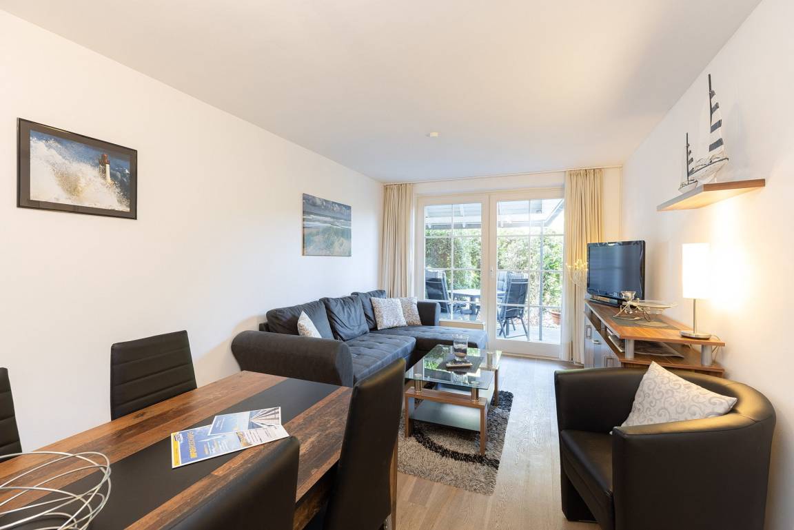 Modernes und Ende 2021 renoviertes Wohn- und Esszimmer im EG mit direktem Zugang zur Terrasse. Das Wohn- und Esszimmer ist mit einem Essplatz für 4 Personen, einer Eck-Couch, 1 Sessel, einem Couchtisch und einer Kommode ausgestattet. Zur Unterhaltung steht ein Flachbildschirm (digitaler Kabel-TV und Radioempfang) sowie ein DVD-Player zur Verfügung. Das Zimmer ist mit Laminatboden ausgelegt.