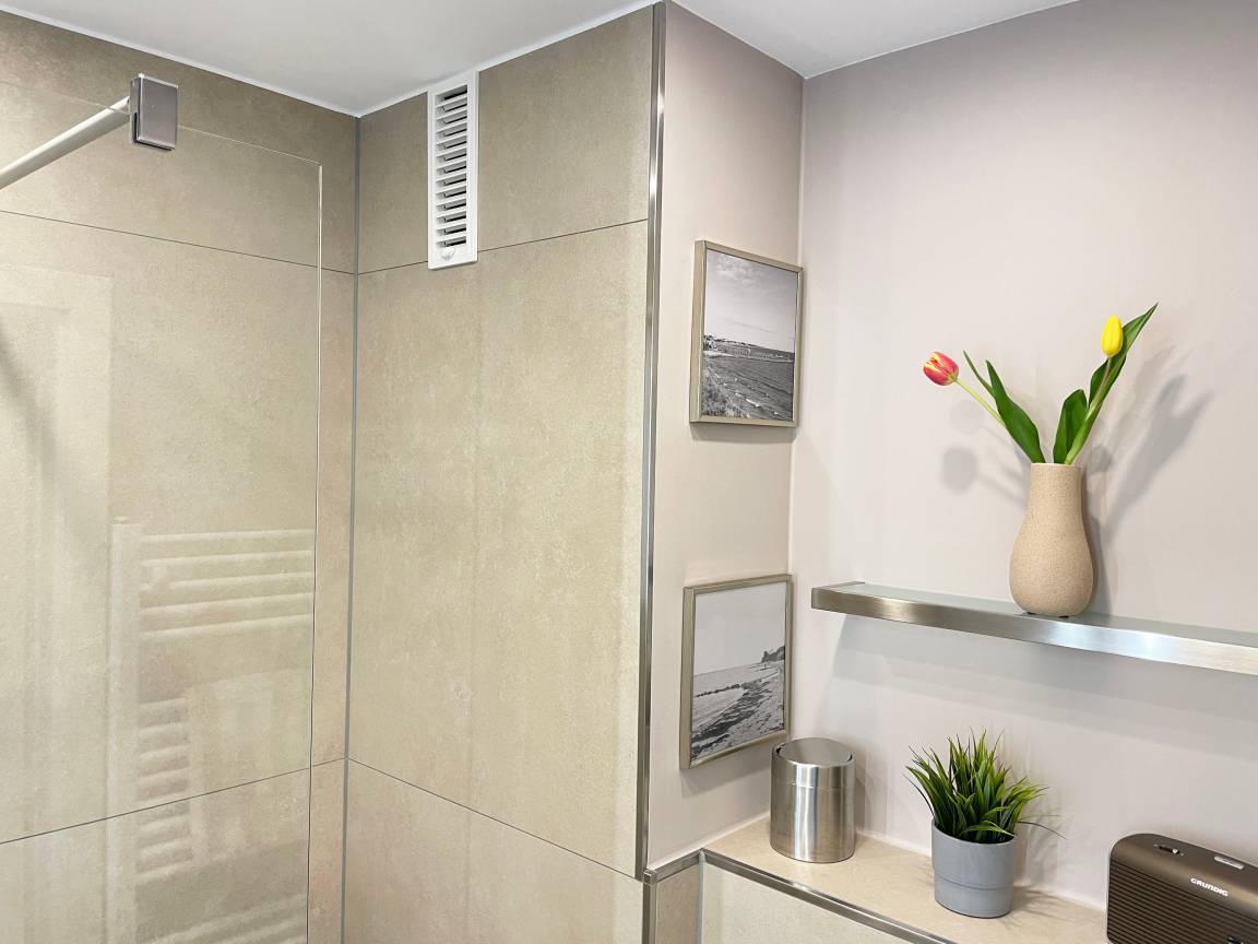 Freuen Sie sich auf ein helles und modernes Bad mit Walk-In Dusche, und genießen Sie die Zeit unter der komfortablen Regendusche (hansgrohe Crometta Showerpipe mit Einhebelmischer). Der Waschtisch bietet Ihnen mit seinen 2 großen Schubladen viel Platz für die persönlichen Utensilien. Hier finden Sie auch einen leistungsfähigen Haartrockner (Braun Satin Hair 7, mit IonTec und Satin Protect Technologie, 2200 Watt).