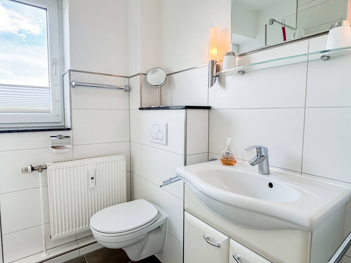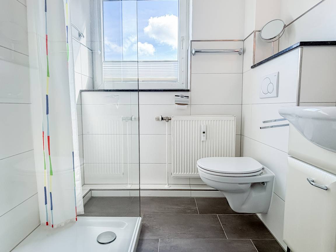 Das neue, moderne Duschbad ist mit Waschbecken und WC ausgestattet.