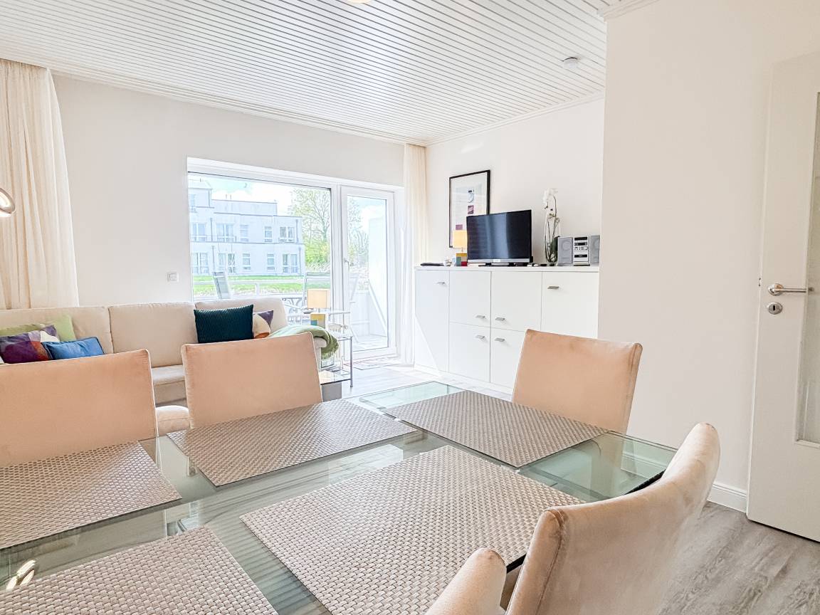 Das helle, liebevoll eingerichtete Wohnzimmer lädt mit einer bequemen Couchgarnitur, einem Flachbild-TV und einem Essplatz für zwei Personen zum Verweilen ein. Von hier gelangen Sie direkt auf den möblierten Balkon – perfekt, um die Abendsonne zu genießen.