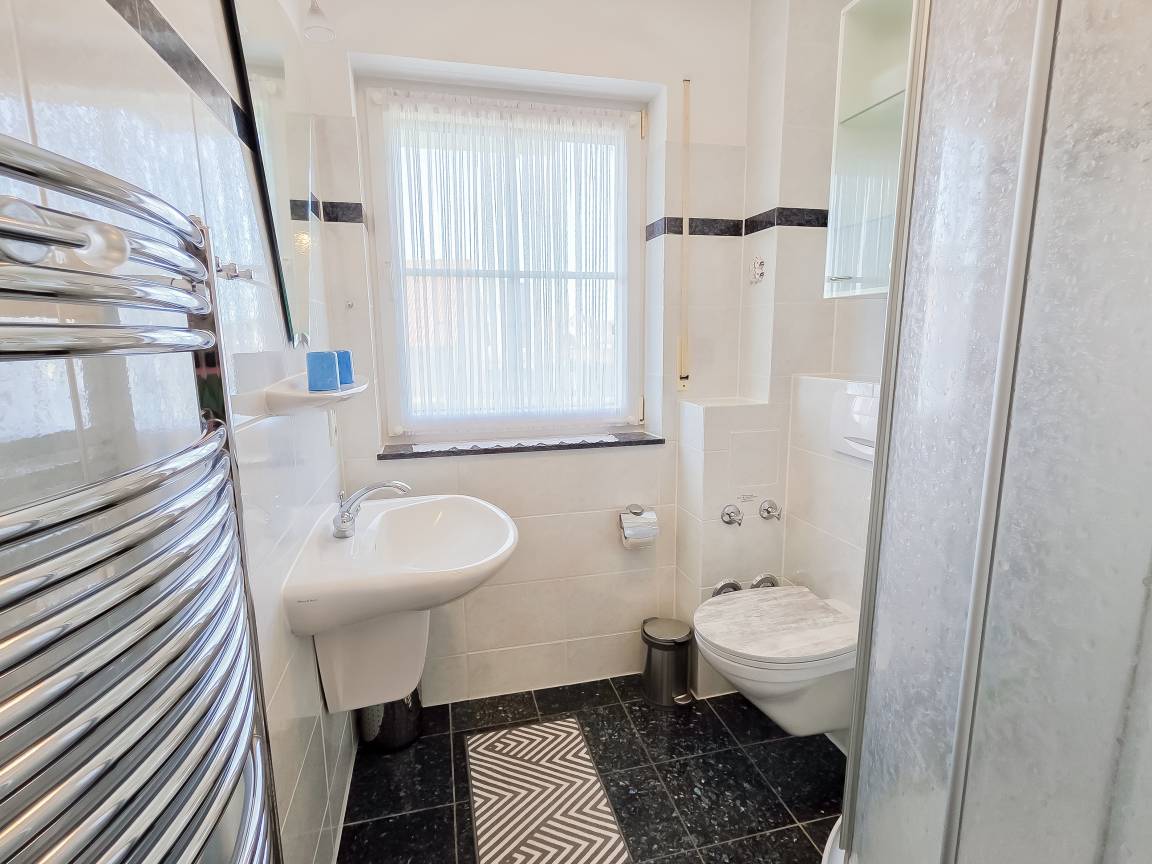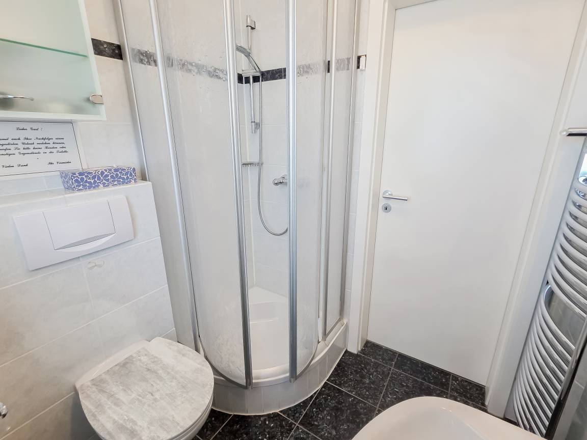 Eine helles, freundliches Duschbad mit Waschbecken, WC und Eckduschkabine ist vorhanden.