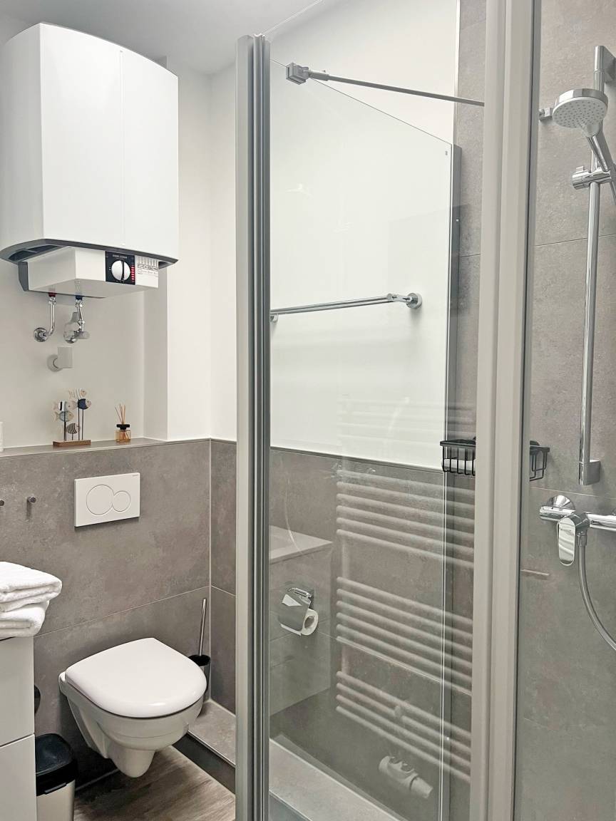 Das moderne Badezimmer ist mit einer Dusche, einem Waschtisch und einer Handtuchheizung ausgestattet. Dank einer Lichtkuppel haben Sie hier besonders viel Tageslicht. Ein Föhn ist vorhanden.