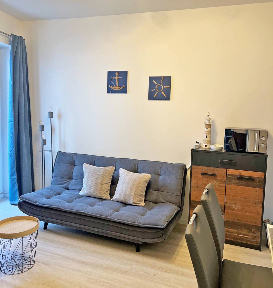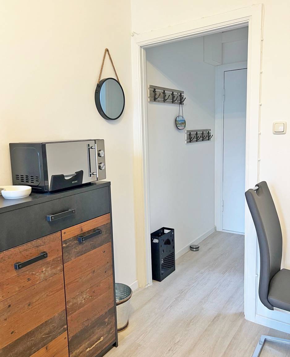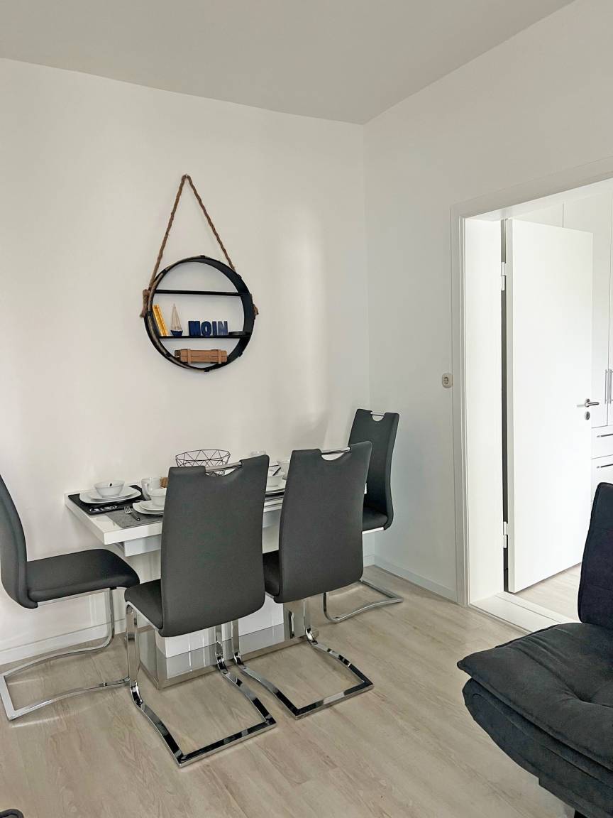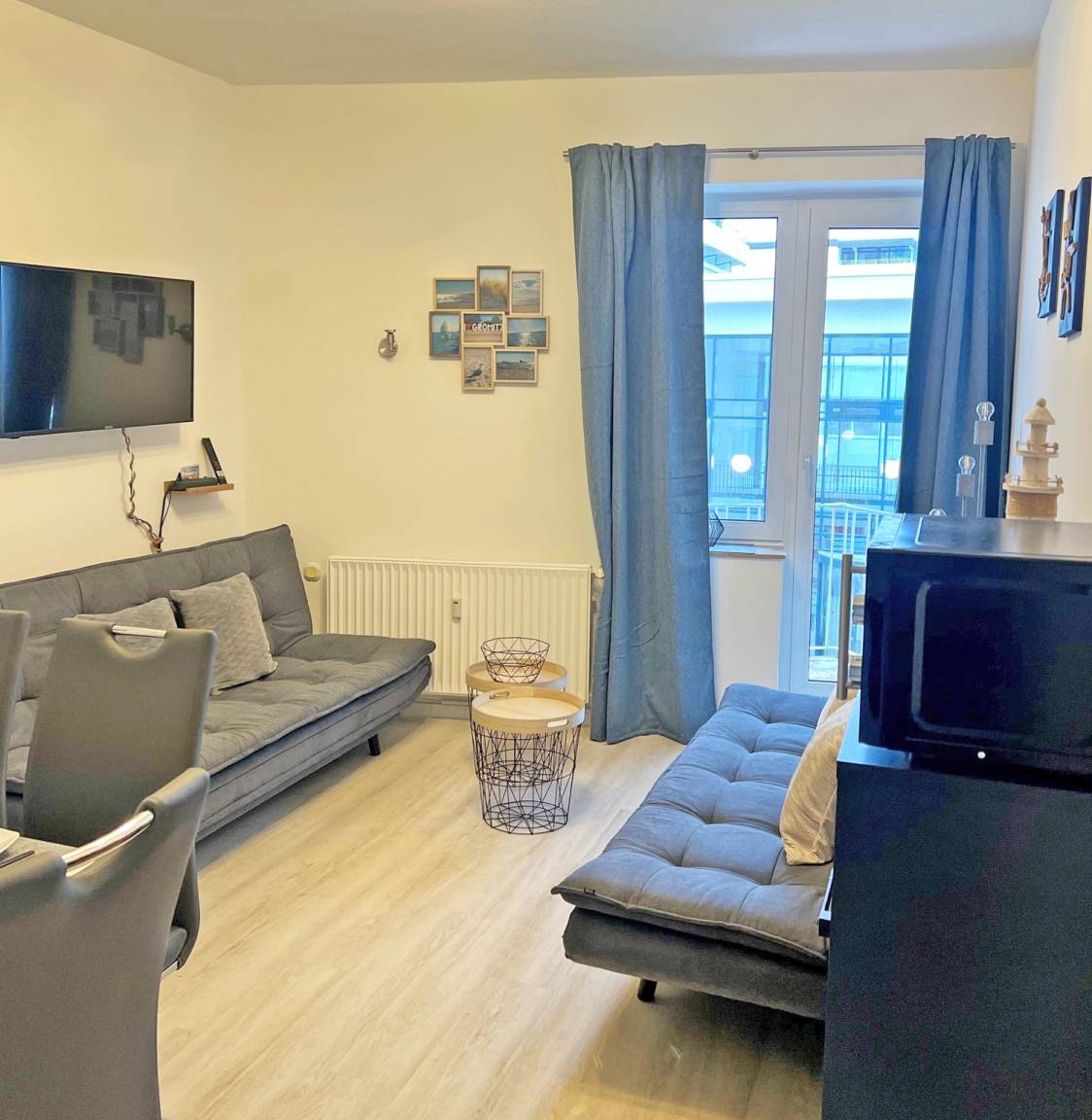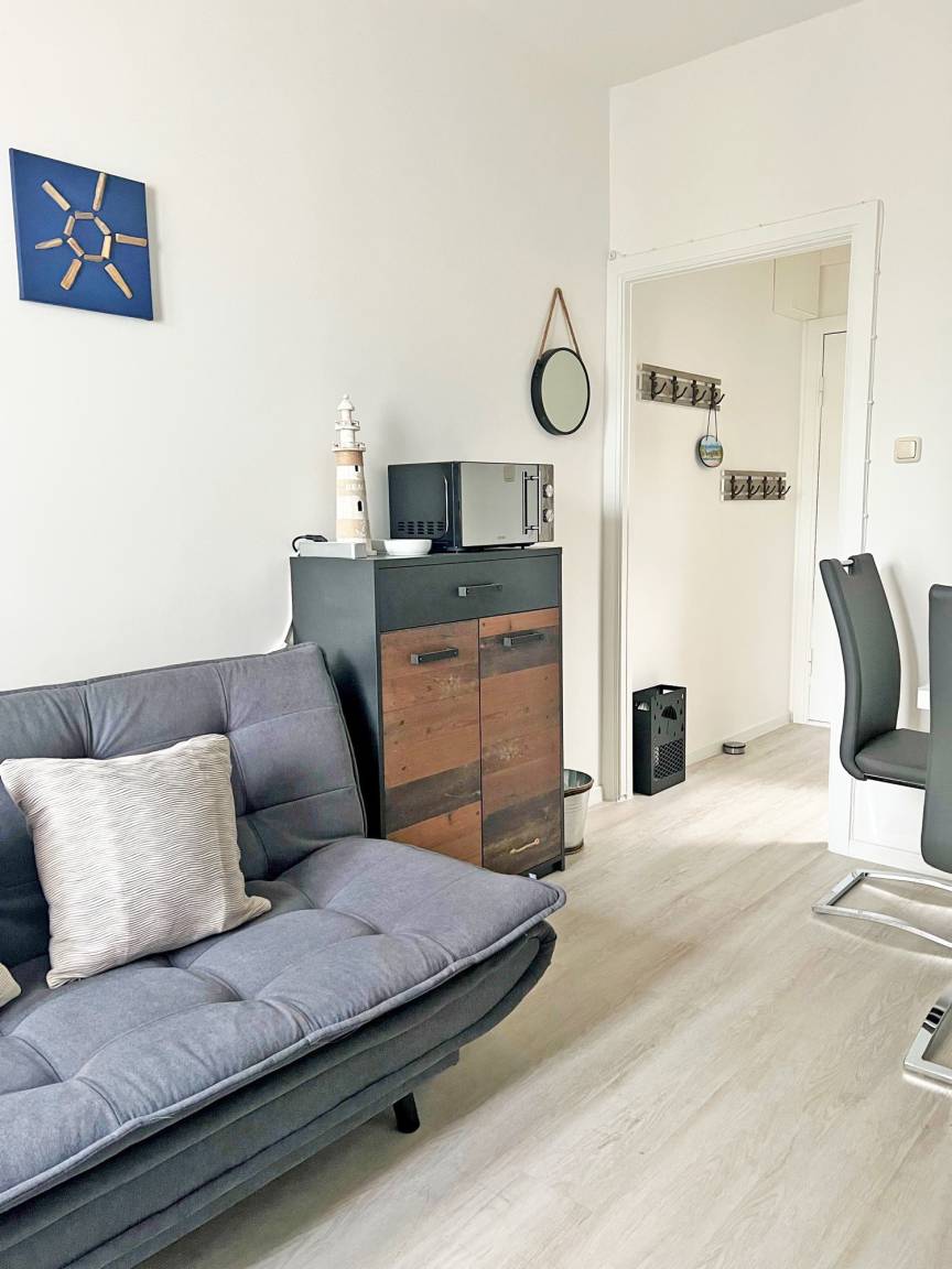 Das moderne Wohnzimmer ist gut ausgestattet mit einem kleinen Essbereich, zwei Sofas (auch als Schlafcouch zu benutzen). Von Wohnzimmerbereich gelangen Sie auf den kleinen Balkon. Mit Süd-West Ausrichtung. Hier stehen Ihnen zwei Balkon Stühle zur Verfügung. Im Wohn- und Schlafzimmer gibt es Verdunkelungsmöglichkeiten (Vorhänge und Plissees). Die separate und gut ausgestattete Küche bietet Ihnen einen Kühlschrank mit Gefrierfach, einen zwei Platten Herd, einen Backofen, einen Geschirrspüler, eine Kaffeemaschine, sowie eine Senseo Pad Maschine.